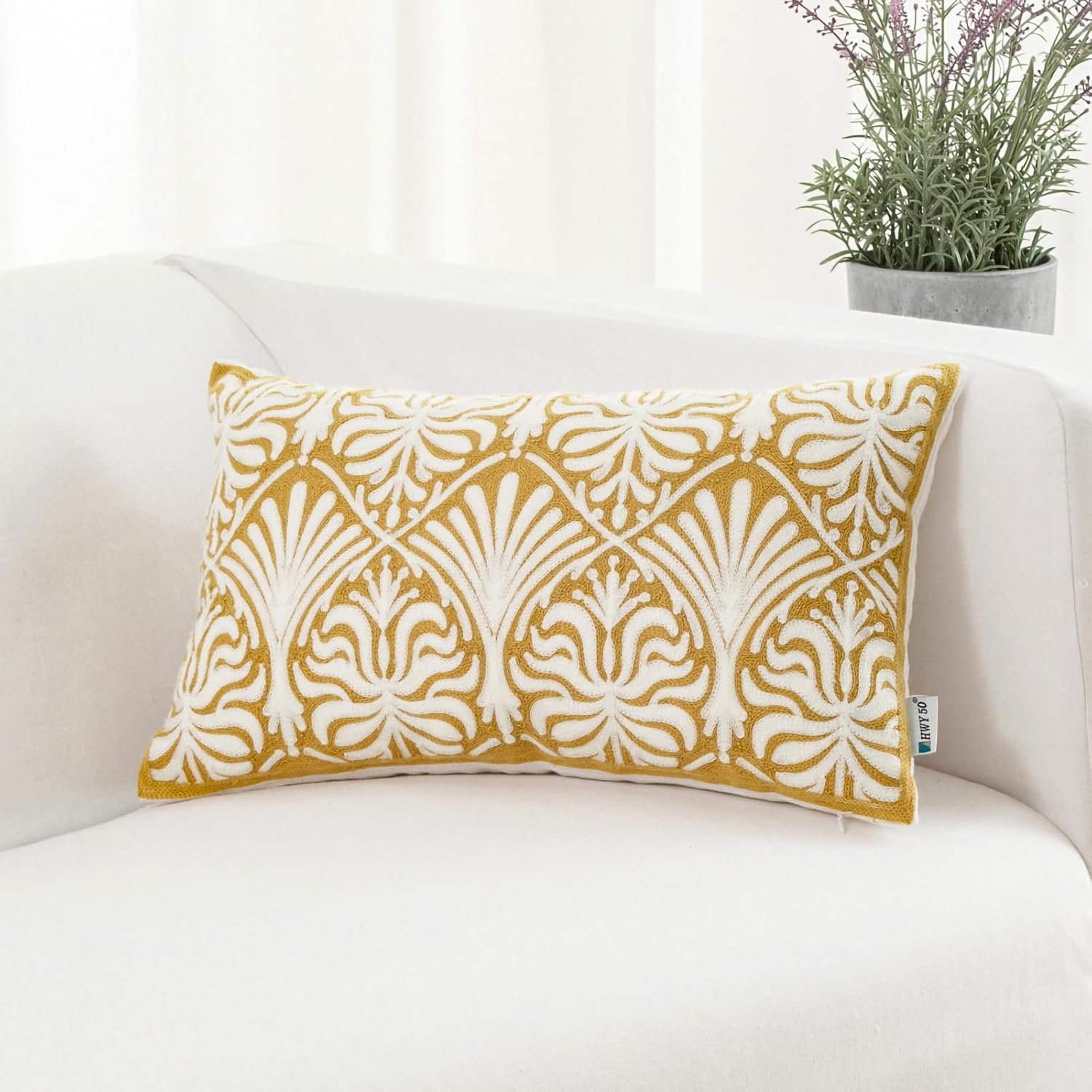 HWY 50 Mustard Yellow Decorative Lumbar Pillow Cover Rectangle 12x20 Inch (1 Piece), Embroidered Cotton Farmhouse Cushion Cover Pillow Case for Sofa Couch Living Room Bed, Minimalist Floral