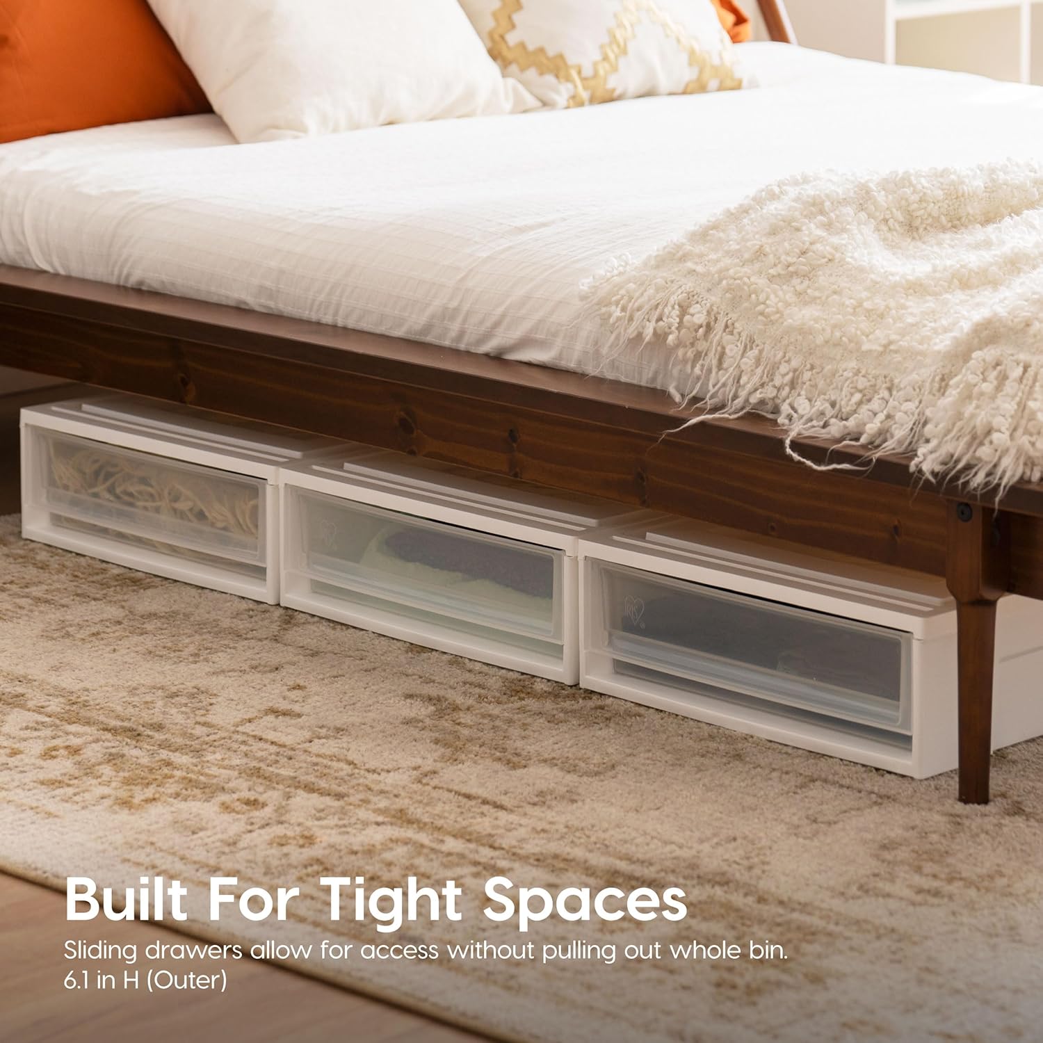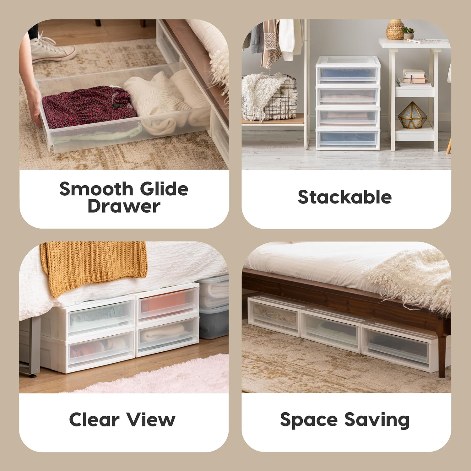 - SPACE / TIME SAVING: The storage tote was designed to fit under most beds to easily slide in and out for easy access to stored items, simply using the smooth-glide drawer. No need to open a lid and put it back to under the bed every time. Secure lids will ensure that all your items remain dry and dust-free.