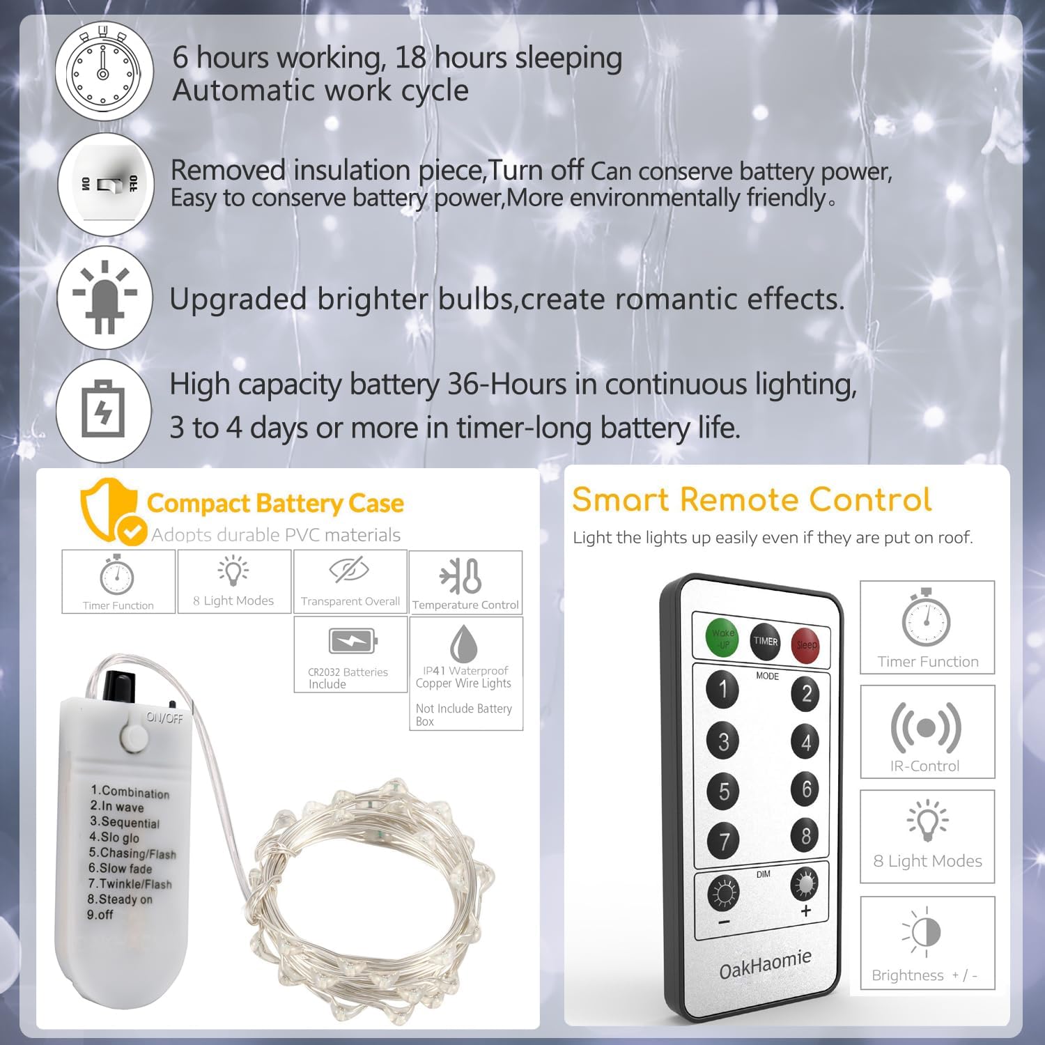 - 【Remote Control Fairy lights】-OakHaomie fairy lights comes with 2pcs remote controllers.Except the basic remote switch function,it also can change lighting mode, brightness adjustment and timing functions. Press the timer button, the light off automatical after 6 hours, and switches it back on at the same time next day,In terms of brightness, The factory default brightness level is set to 50%,from soft to bright, the brightness can be adjusted ; 8 lighting modes lights is suitable for everyday decorations and holiday decorations, the soft lighting will add a delicate and setting off a warm and comfortable atmosphere..