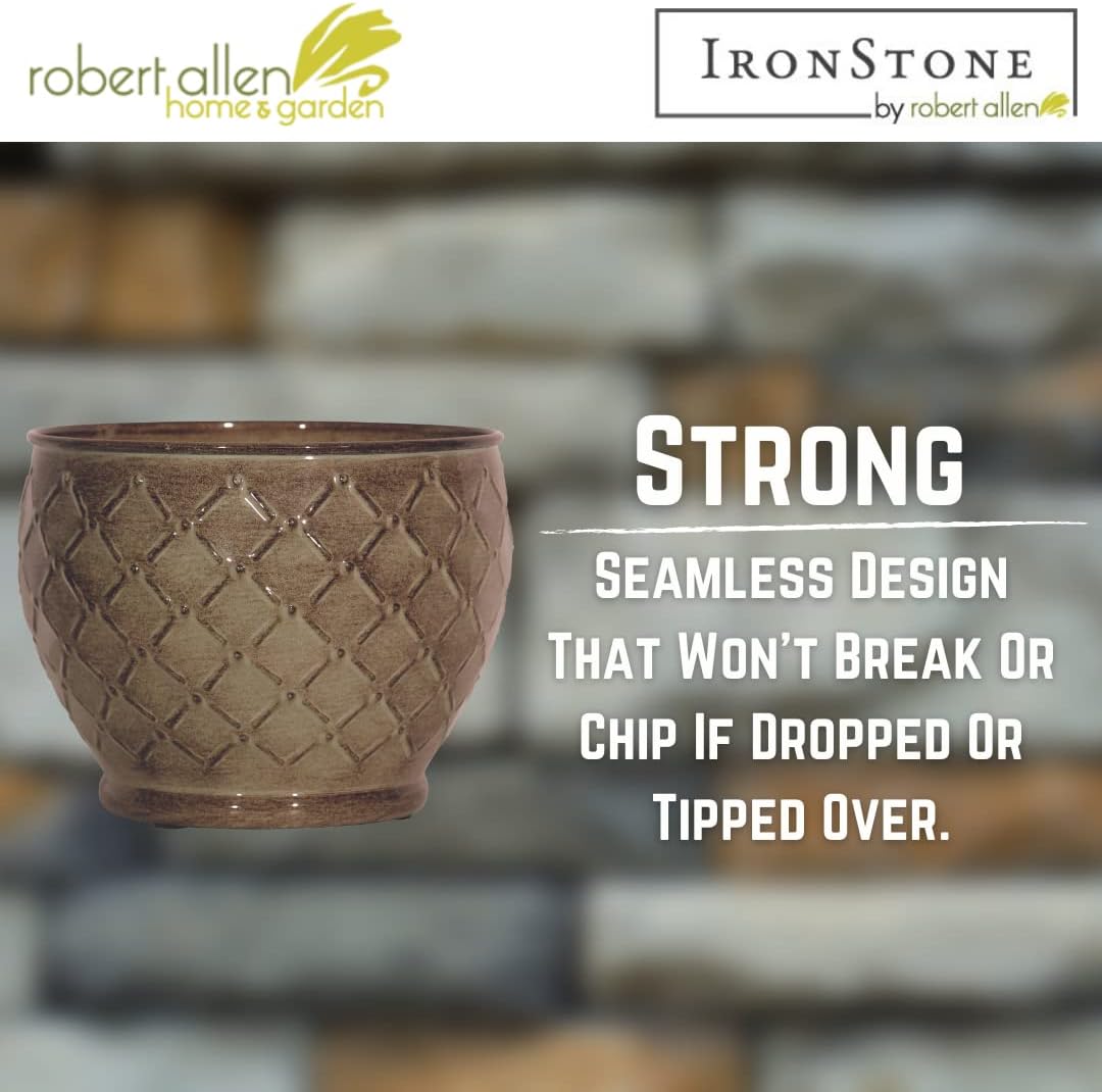 - -DRAINAGE – Contains a removable drain plug. Each IronStone planter comes with a drain plug that proves very useful whether inside or out during the changing seasons.