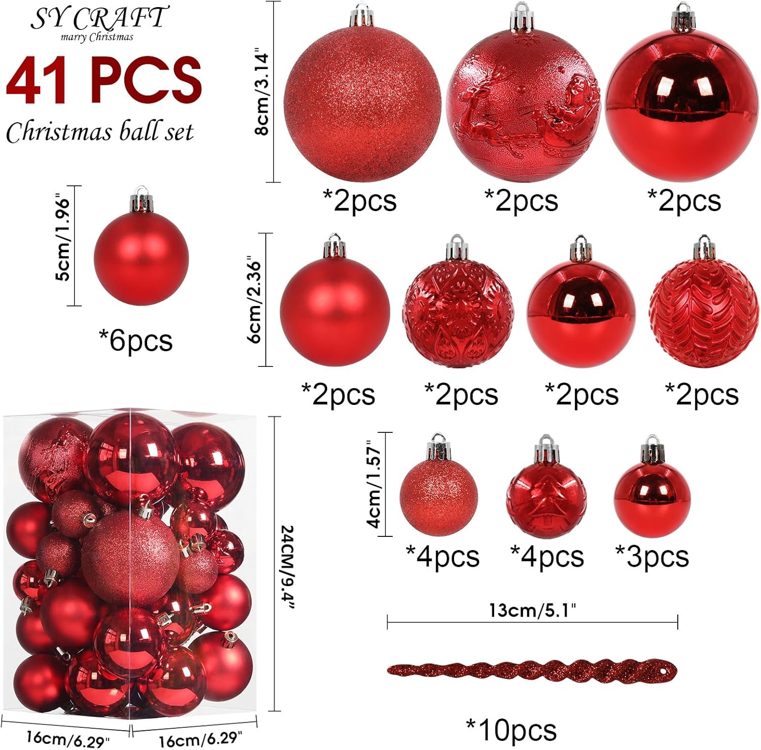 - *[BALL SIZE]The set has 4 extra large balls 3.14", 10 large balls 2.36", 6 medium balls 1.96'', 11 small balls 1.57'', 10 ice bar pendants, Christmas Balls are in 11 Different Colors,Each Barrel Contains 41 Pieces,great to Hang on the Top part or to fill Small Place of Big Trees.