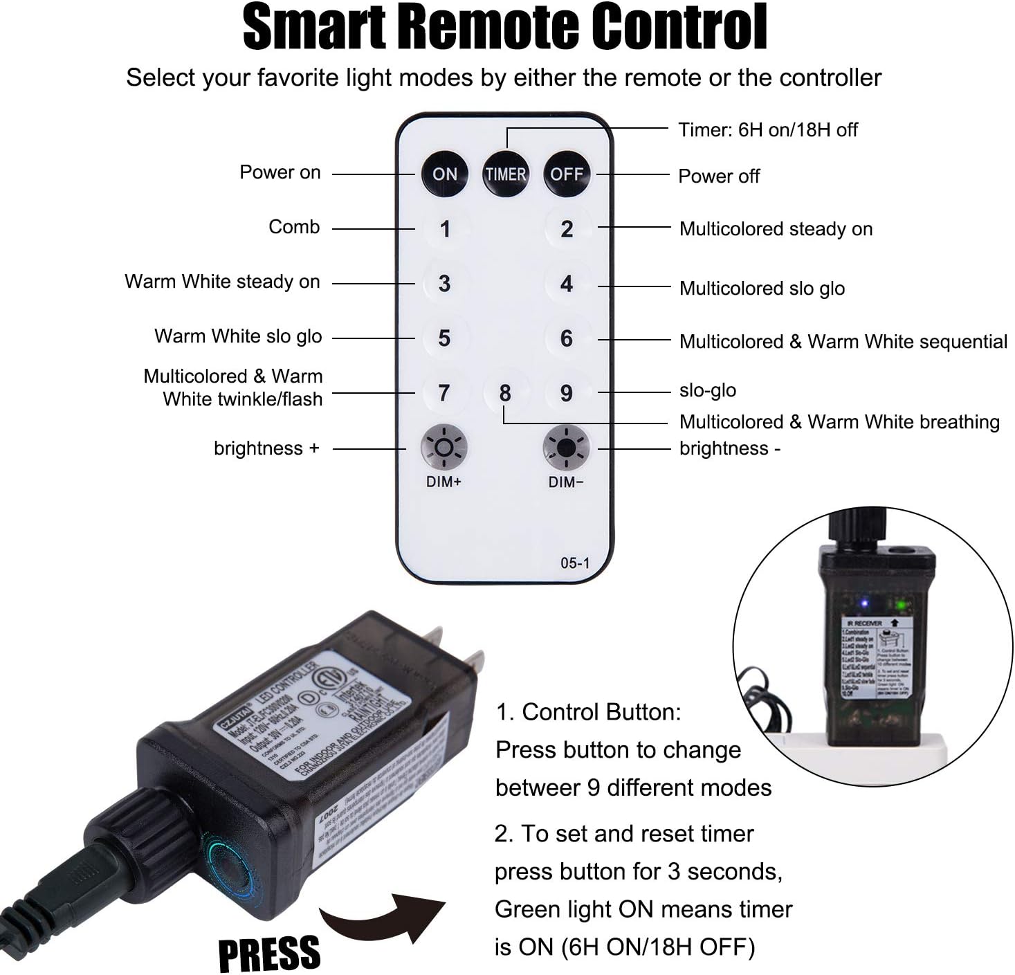 - Timer & Regulable Lighting & 8 Mode Lighting: These Christmas lights indoor have 100%-75%-50%-25% 4-level brightness and 6H on, 18H off time function. And the built-in memory chip will save your last mode setting, so there is no need to reset! These twinkle lights have 8 fun settings where you can choose various flickers or constant on option. These 360º sparkling warm white & multicolor lights can not only provide good lighting effects but also bring a more romantic festive atmosphere