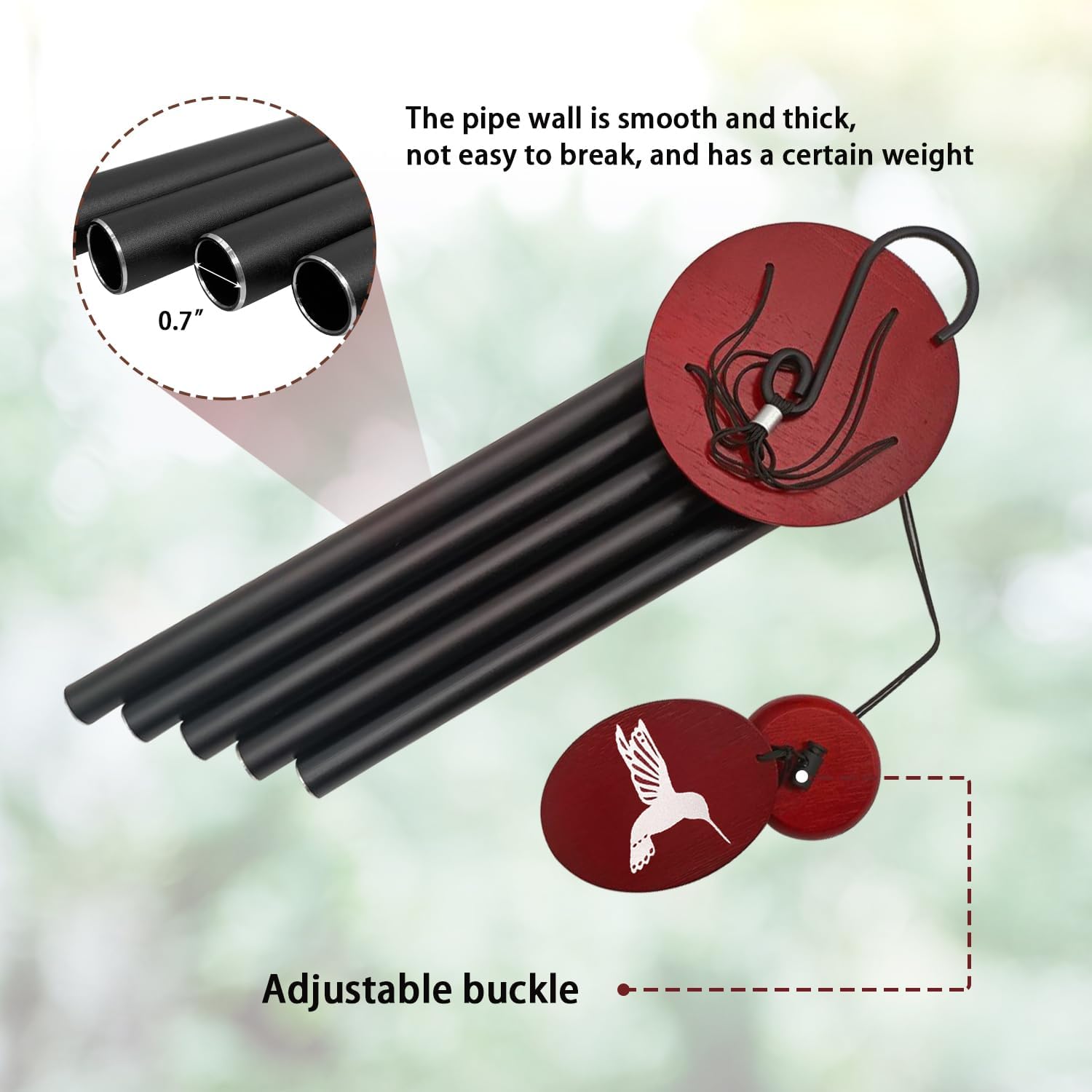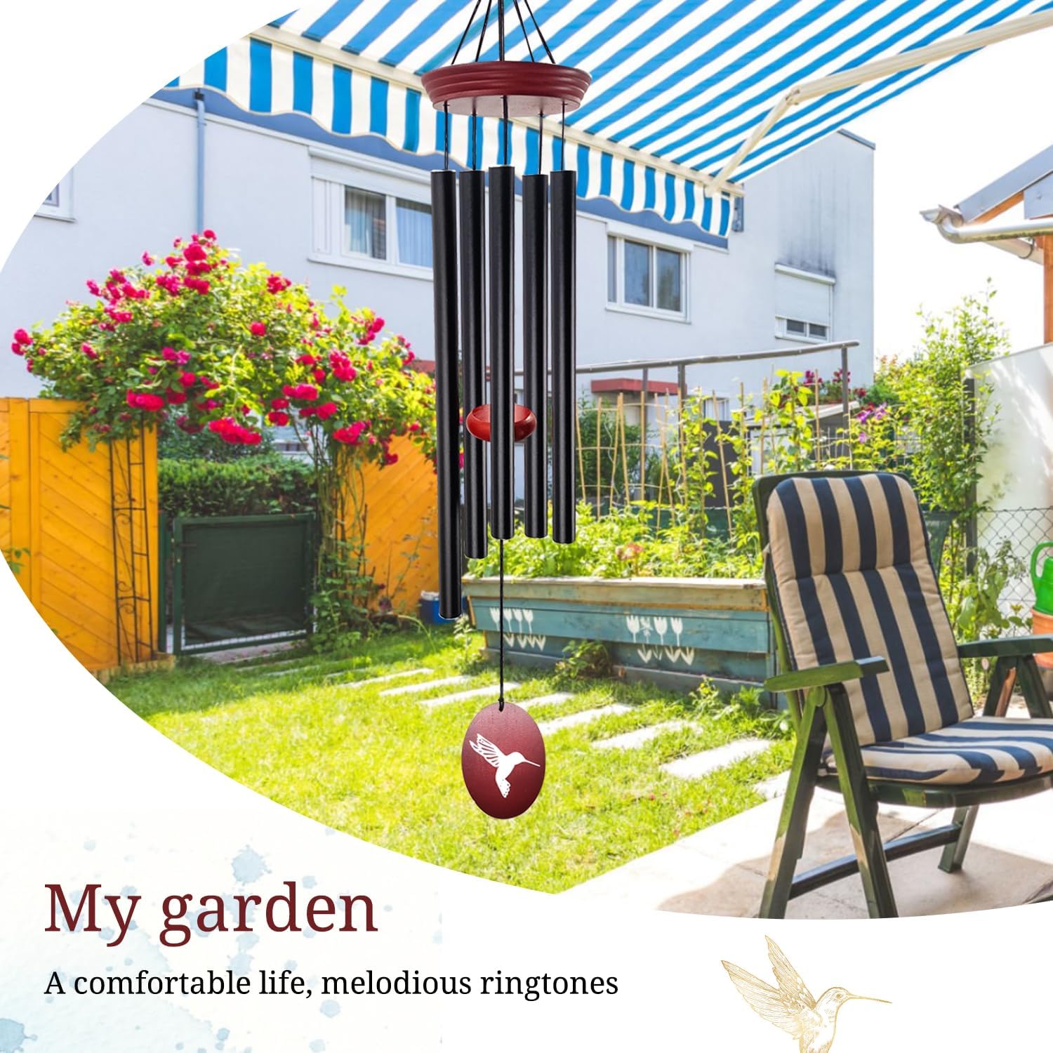 - Elegant Hummingbird Design--Featuring a hummingbird-printed wind sail and sleek black matte aluminum tubes, this wind chime adds a stylish and artistic touch to your garden, patio, or balcony.
