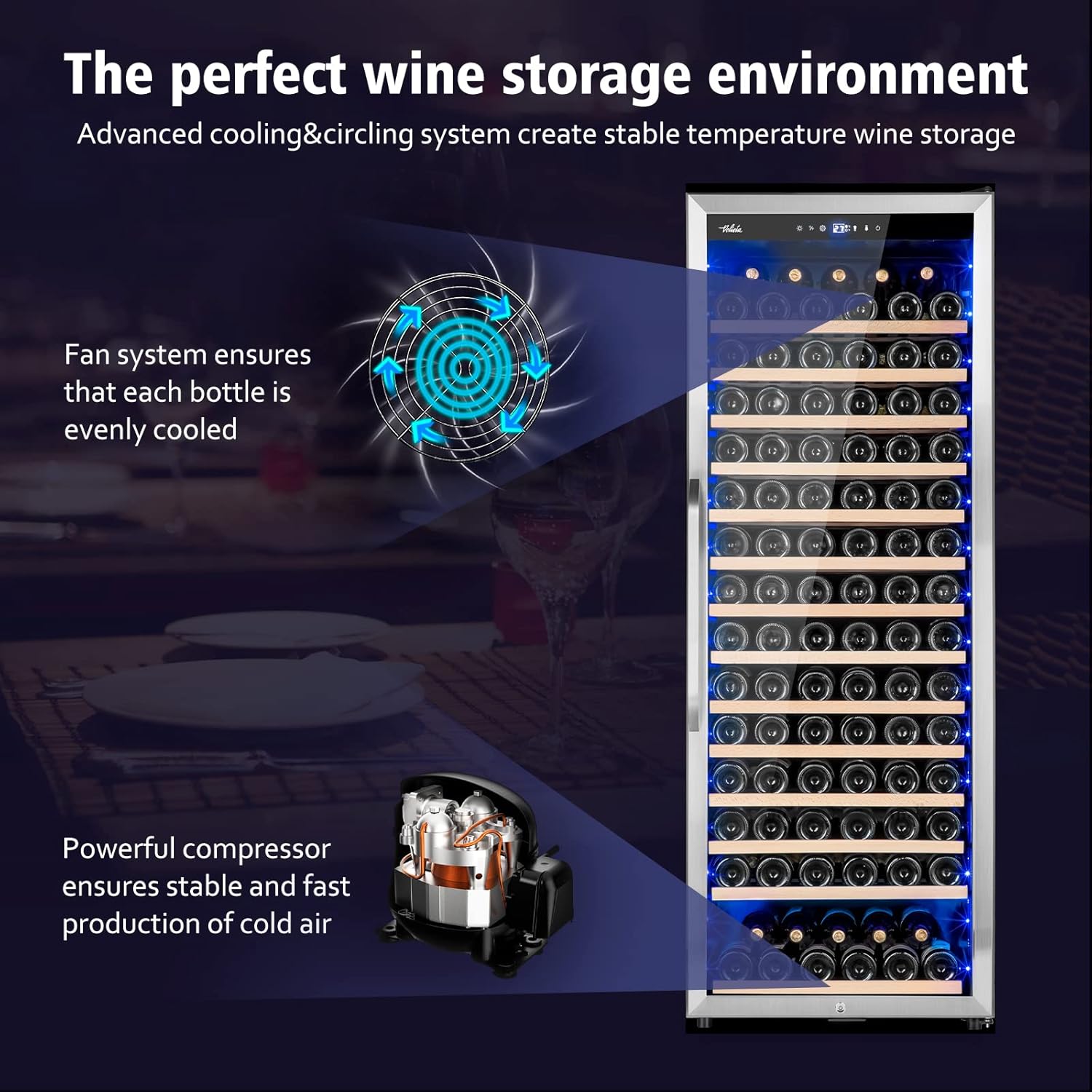 - 【 Blue Protective Light &Smart Control 】The wine cooler with a blue light can effectively protect the tannins in wine so that it can maintain the perfect taste and provide you a perfect romantic atmosphere. What’s more, the Velieta wine fridge is convenience to operate with a smart LED control.
