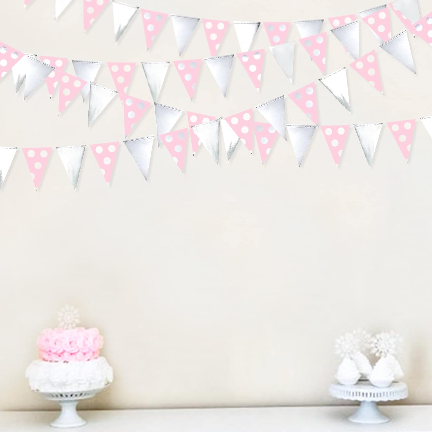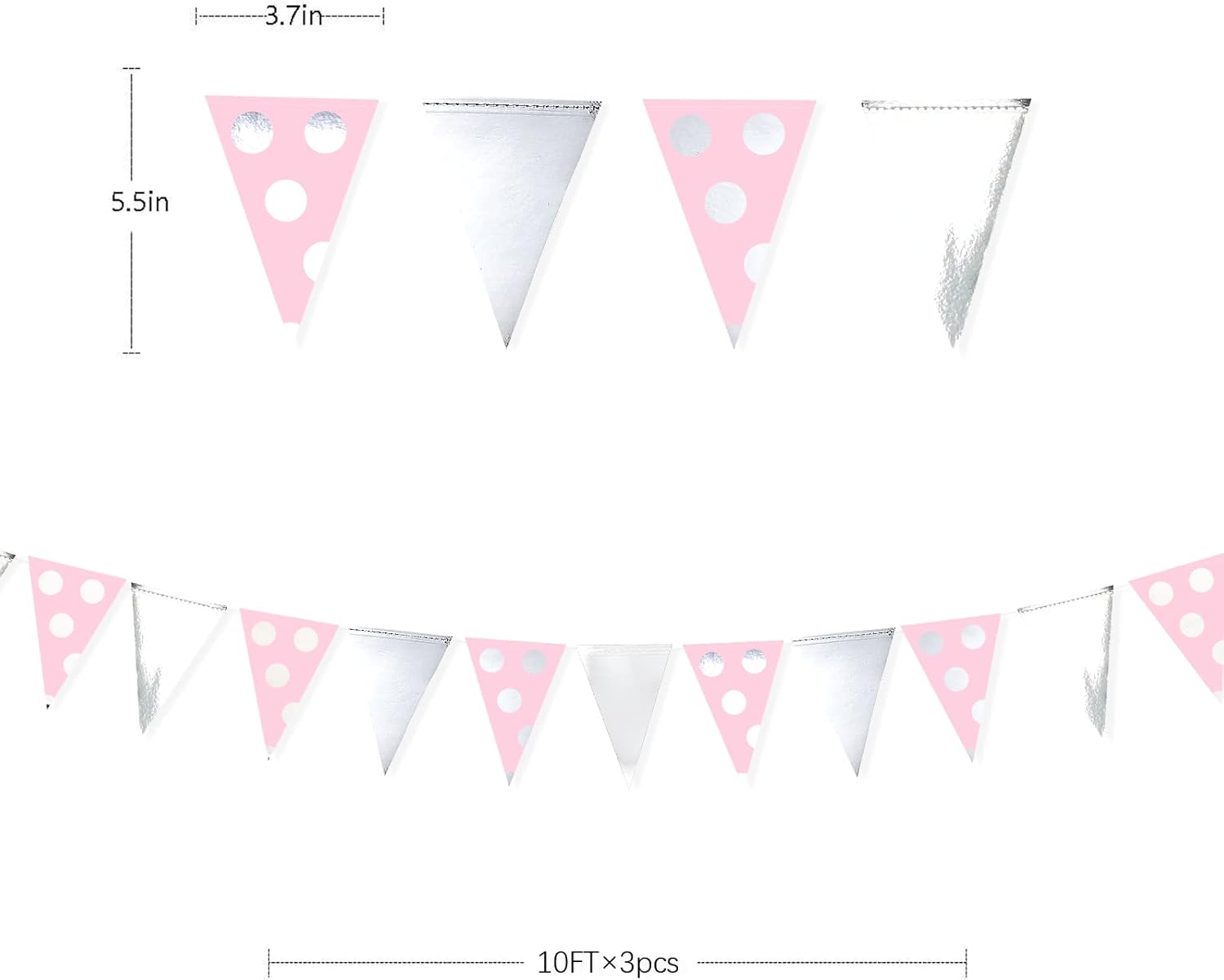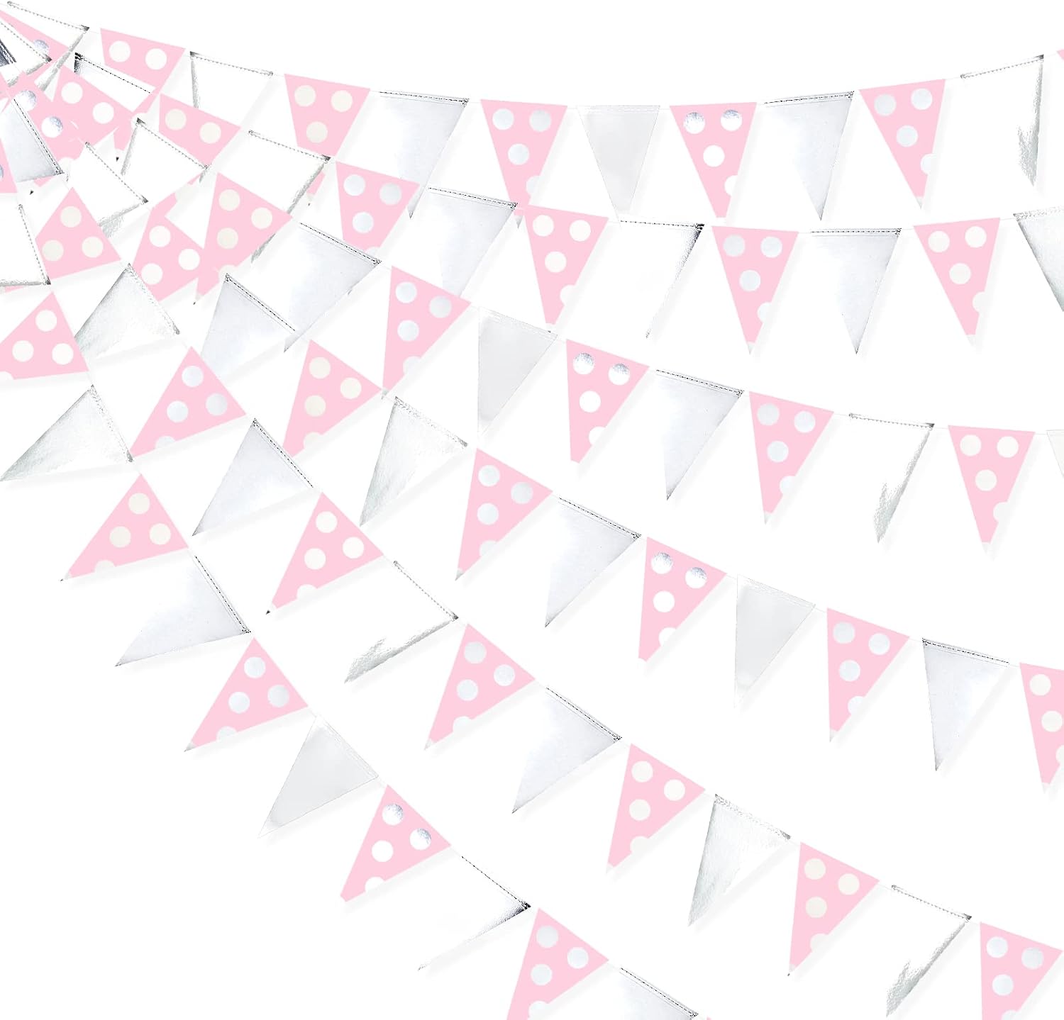 - Environmental Material - Our silver pink polka dot hanging pennants banner are made of two different materials paper. Double sided metallic paper and high quality cardstock, carefully hand-made and machine-sewn together with thread.durable and reusable.