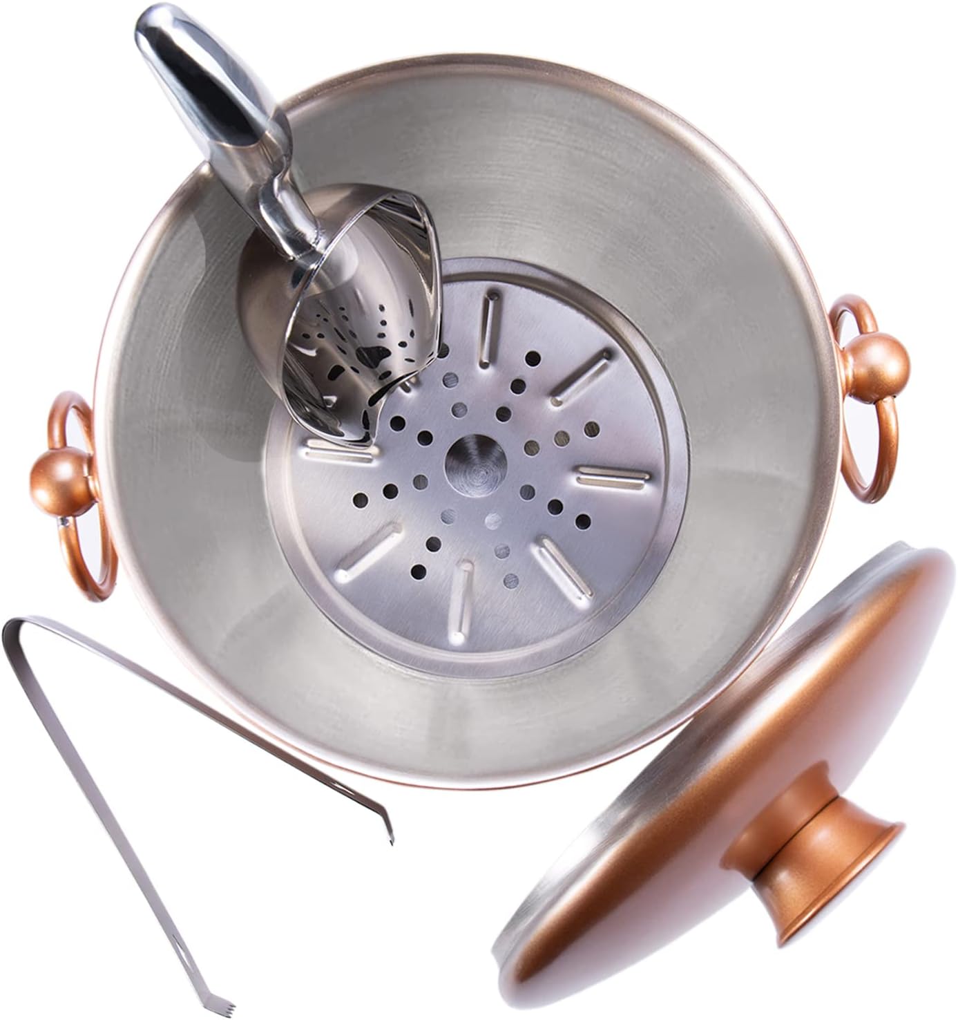 Ice Bucket with Lid, Scoop, Tongs and Strainer - Well Made Insulated Stainless Steel Keep Ice Frozen Longer - Ideal for Cocktail Bar, Parties, Chilling Wine, Champagne - 3 Liter (Copper)