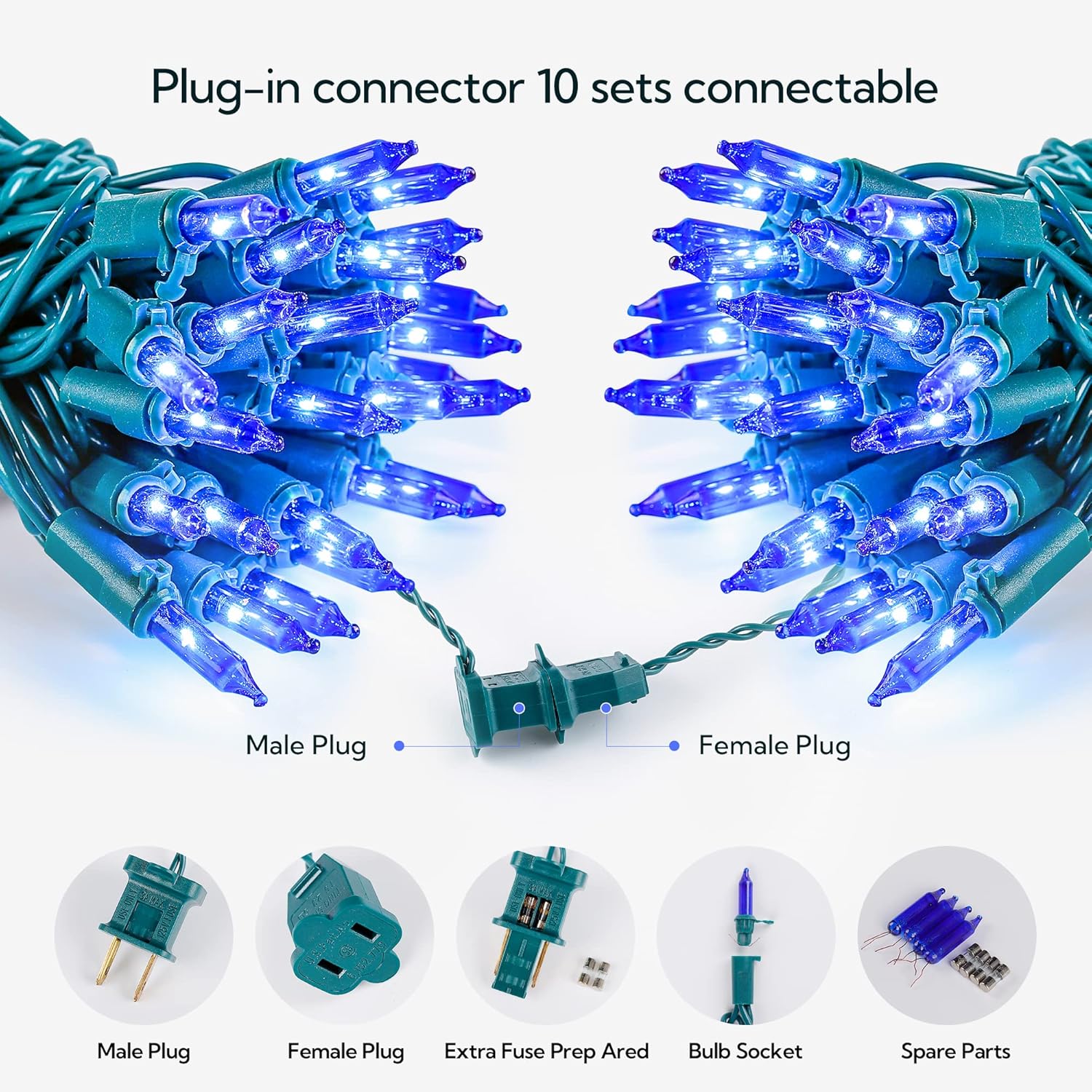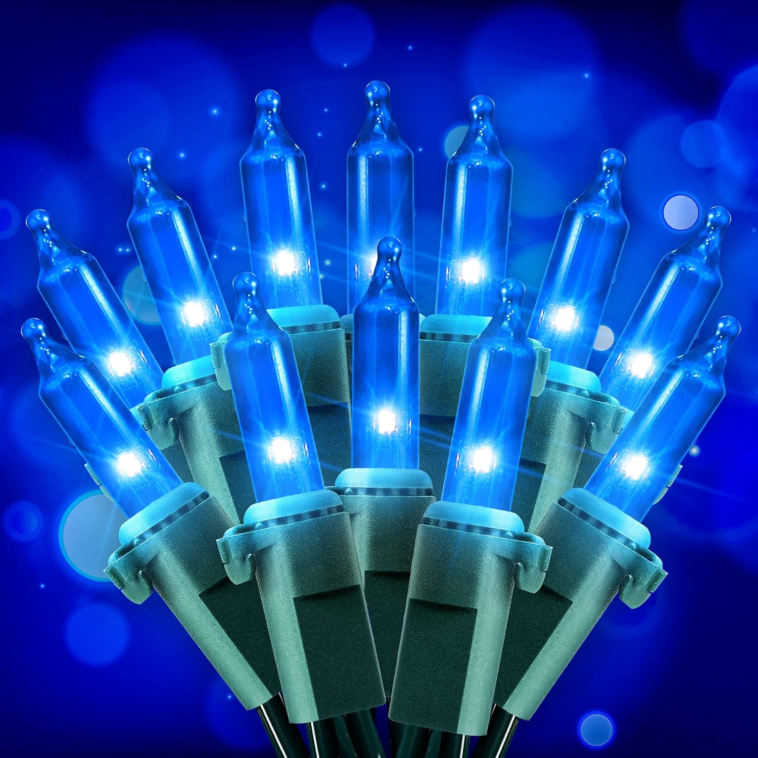 - ♥2Pack Incandescent Christmas Lights:Hopolon 2 PACK 50L Blue Christmas mini lights is 13ft in total-Green wire with Bulbs: 3.5m/11.5ft, cord without lights50cm/1.5ft, spacing between every bulb: 7cm/2.76in. With Thicker green wire with strong insulated copper core, tangle-free to use,High quality UL certified products ensure the safety of you and your family.