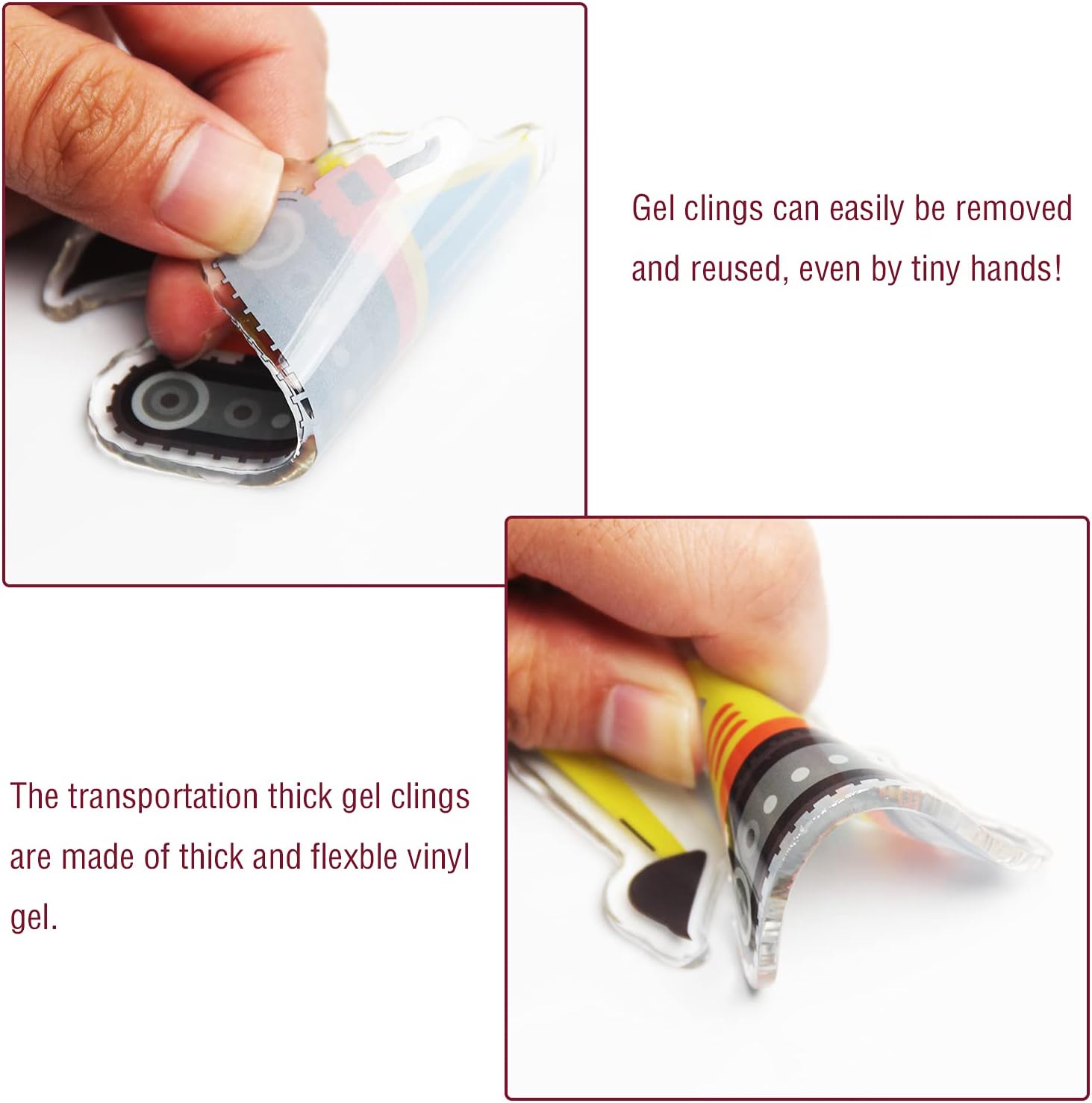 - Removable and reusable: the transportation thick gel window clings are vinyl gel clings which can easily be removed and applied for a long time, even by tiny hands, you can remove these thick gel clings anytime and reuse them year after year, they don't leave any residue on the glass