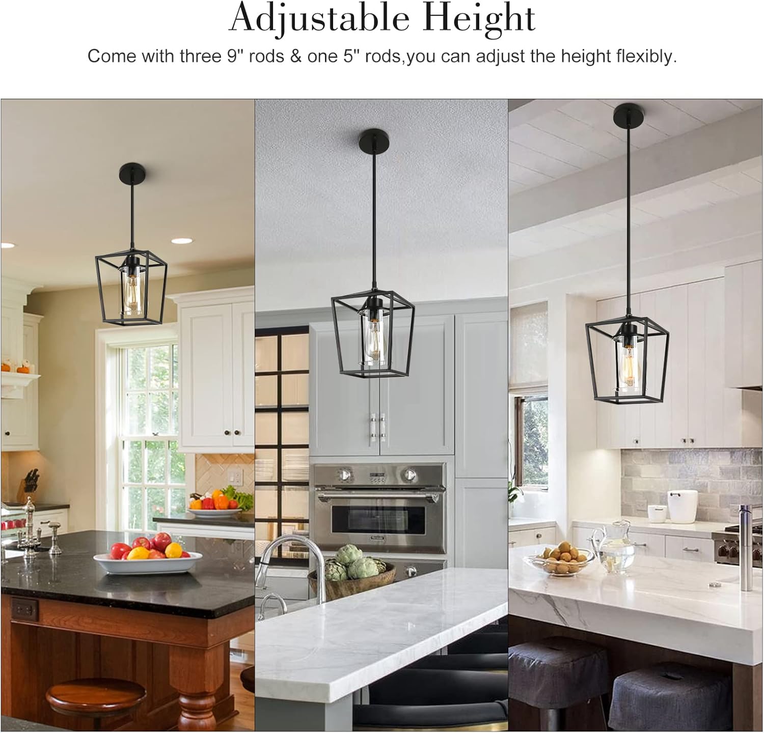 - 【Adjustable Height】Pendant light fixtures: 5.9 INCES x 5.9 INCHES x 8.27 INCHES (15CM*15CM*21CM), Come with 4 rods, including 3 9-inch and 1 5-inch rods.(Max HANING HEIGHT WITH LAMP: 48.9 INCHES /111.5CM).You can flexibly adjust the height of this modern pendant lighting by connecting some or all these rods. This kitchen island lighting won't sway or swing, can be fixed to whatever angle you'd like.