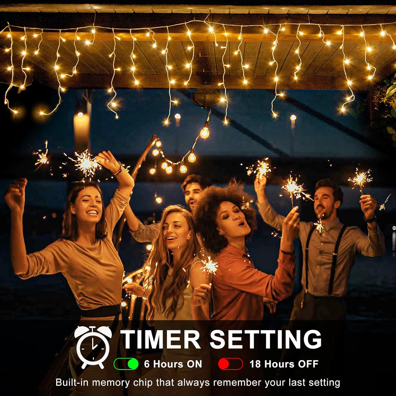 - [Timer & Memory Function] - Press and hold the button of the plug for 3s until the green light comes on, then the timer function starts, 6 hours on and 18 hours off. If you want to keep the led icicle lights on all the time, just press the button for 3s to cancel the timer function. A built-in memory chip will remember the last light mode of the lights so when the power is restored, they will resume in the last state they were in.