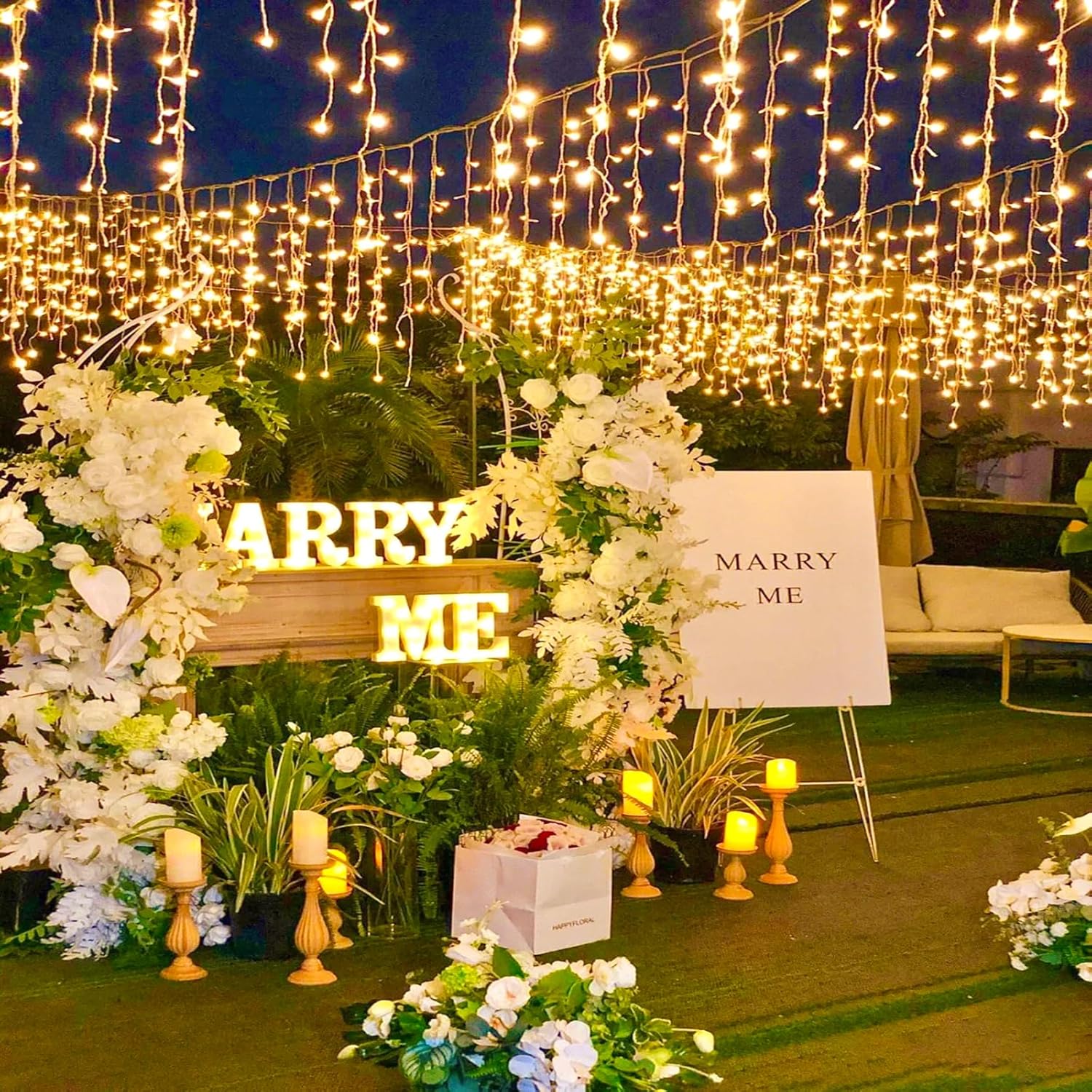 - [8 Modes Twinkle Lights] - The curtain lights has 8 different lighting modes for you: 1.Combination, 2.In Waves, 3. Sequential, 4.Slo-glo, 5.Chasing/Flash, 6.Slow Fade, 7.Twinkle/Flash, 8.Steady On. Different lighting modes controlled by only one button, directly plug in and unplug the controller for power on and off. You can easily to hang the icicle lights outdoor on the eaves, patio, garage, top of hall, balcony, wedding or anywhere you want.