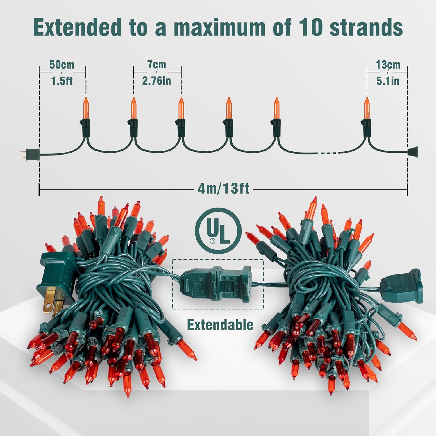 - 🎃Incandescent Orange Mini Lights:Beewin orange old-fashion incandescent Christmas lights, 2PACK 50 count 13ft green wire clear lights string set,each bulb space 2.76in,built-in 3A fuse for safe use.Best choice for Halloween decoration.Extra 4 bulbs and 4 fuses included.