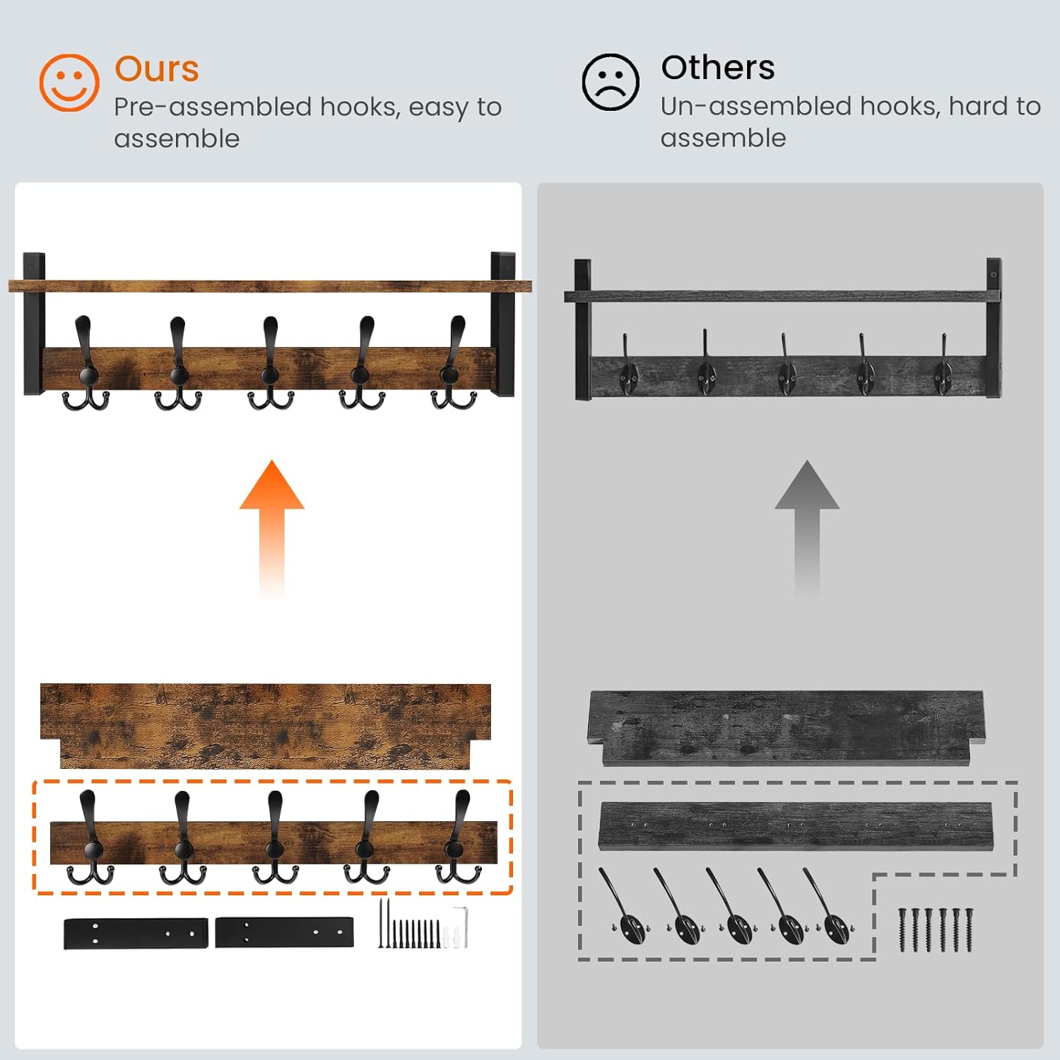 - 2-IN-1 DESIGN: With a 24" long 4.52" deep top shelf, the coat rack wall mount offers additional storage space for displaying photo frames, potted plants, and other collectibles, while the 5 tri hooks underneath provide ample storage for clothes, bags, keys, umbrellas, and more