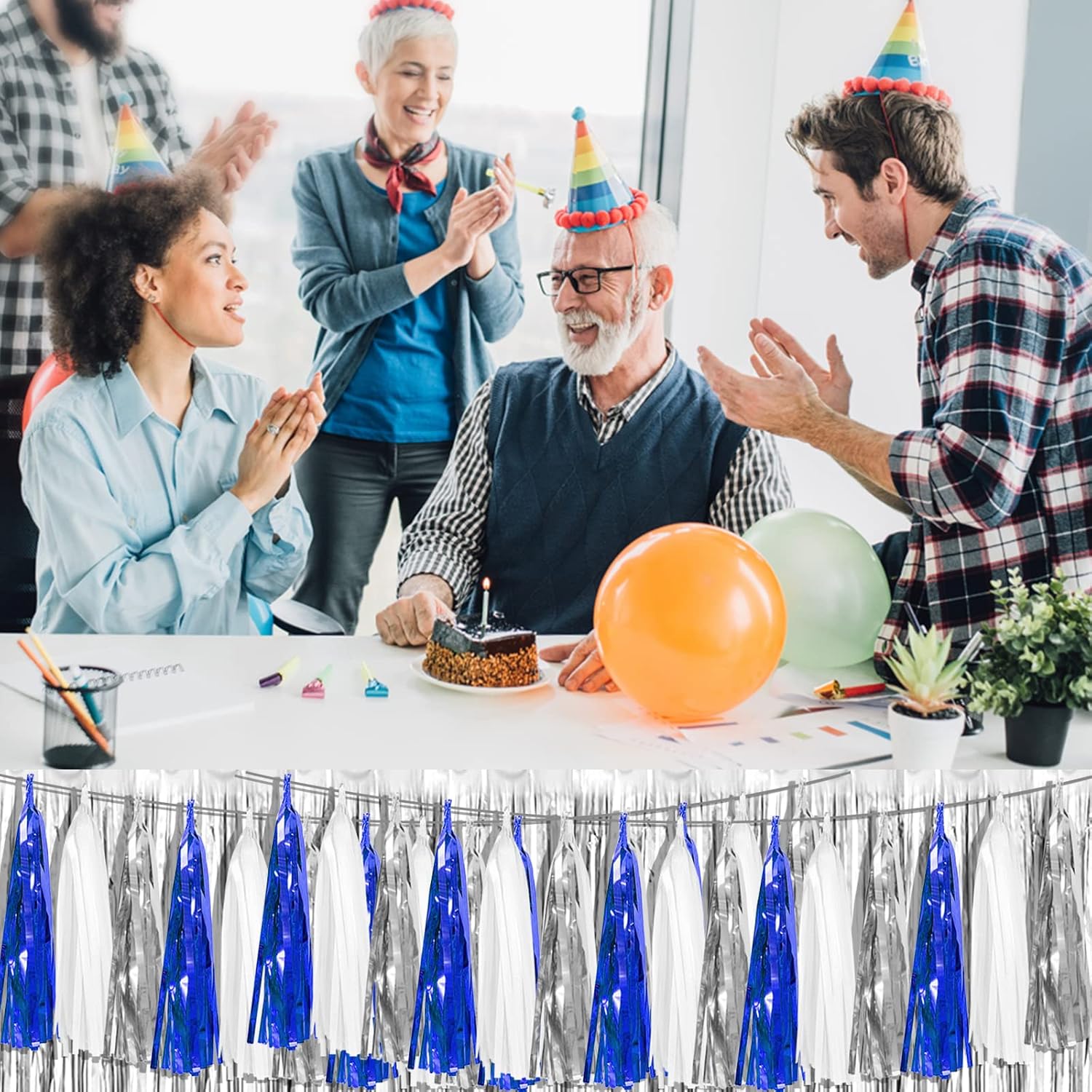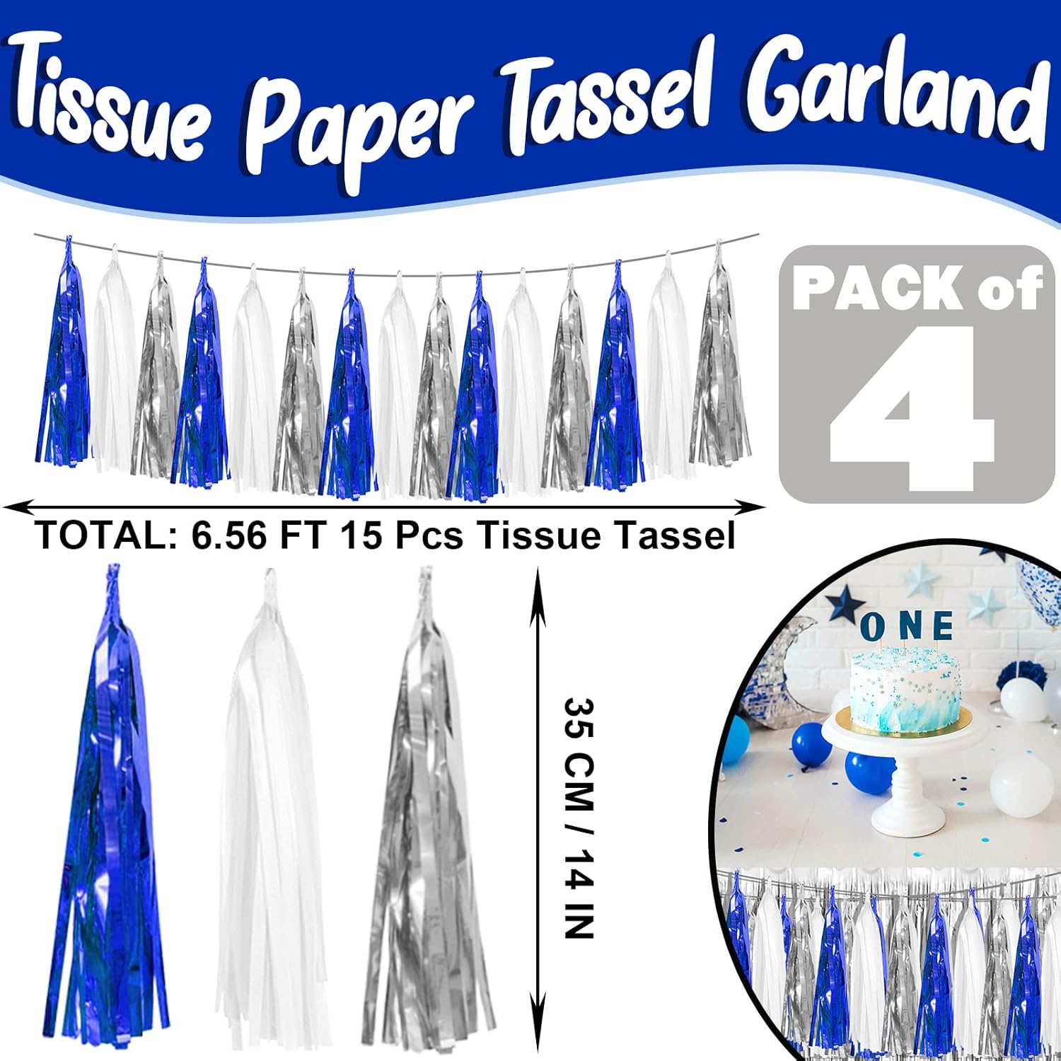- 【Navy Blue White Silver Party Supplies Set】: The total length of the navy blue white silver birthday tassels banner is 39.3 feet, divided into 4 strips, each 9.8 feet long. Each banner contains 15 tassels, and each tassel measures 14 inches, for birthday decorations many occasions, and so on