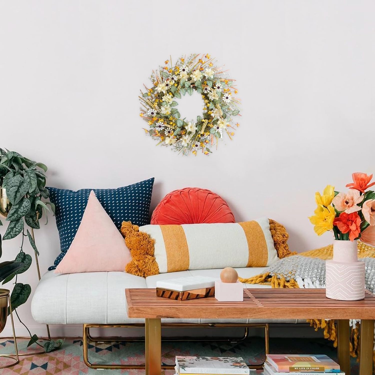 - This spring summer wreath contains a variety of decorations, such as yellow and white daisies, ear of wheat, green leaves and so on.The vibrant and full-bodied daisies as ornaments make this wreath even more lively and vibrant. In addition, the thick wreath base is made of natural rattan rings, which is not easy to be deformed and damaged, and it feels very real. The overall shape is very full, making it the best choice for spring summer.