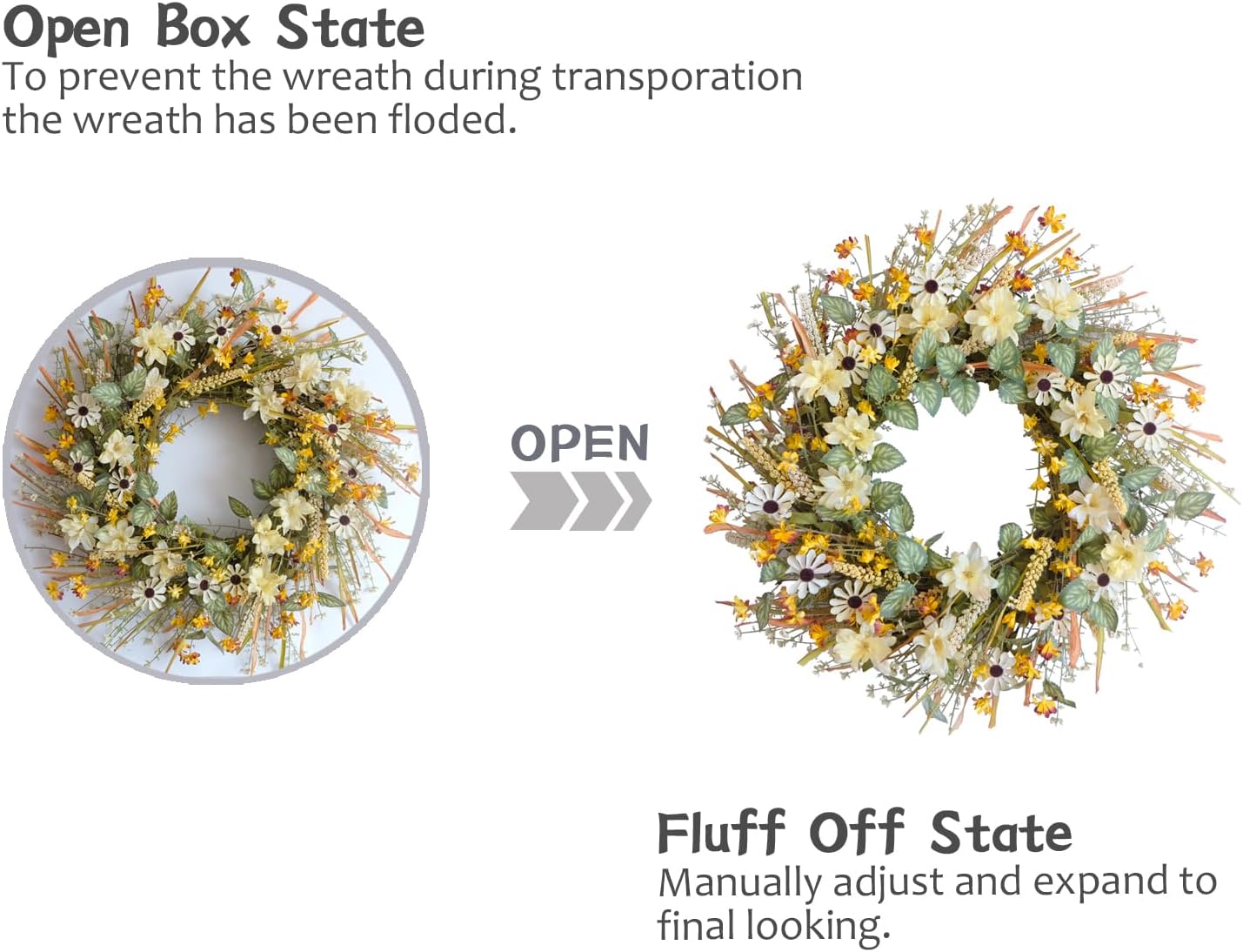 idyllic 20 Inches Spring Summer Front Door Wreath, Yellow and White Daisies Flowers, Ear of Wheat, Green Leaves Wreath for Front Door
