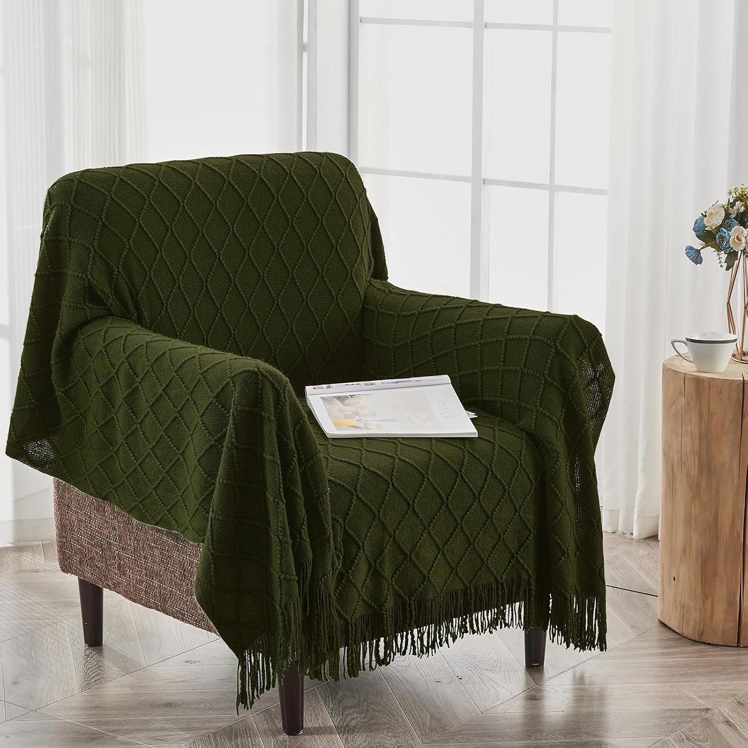 inhand Knitted Throw Blankets for Couch and Bed, Soft Cozy Knit Blanket with Tassel, Dark Green Lightweight Decorative Blankets and Throws, Farmhouse Warm Woven Blanket for Men and Women, 50"x60"