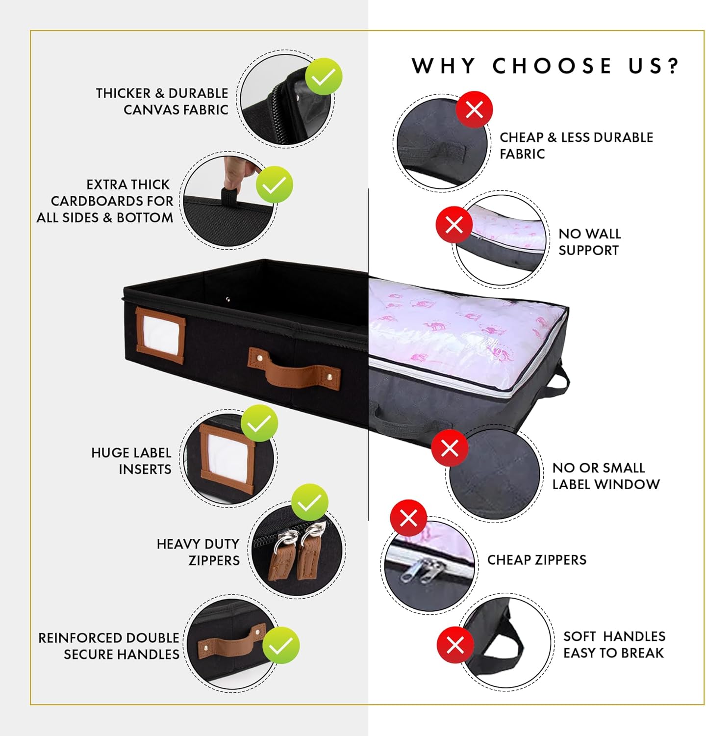 - 𝐇𝐞𝐚𝐯𝐲 𝐃𝐮𝐭𝐲 𝐙𝐢𝐩𝐩𝐞𝐫 𝐂𝐥𝐨𝐬𝐮𝐫𝐞: Committed to safety and organization, our under bed flat storage boxes are precisely tailored. The zipper of our storage containers for under the bed ensures that the items inside are protected from dust and other elements that can cause damage. Our under bed storage with lid are pusposely designed with durability and strength making it ideal for flat clothing storage that require frequent opening and closing, or those that carry heavy loads.
