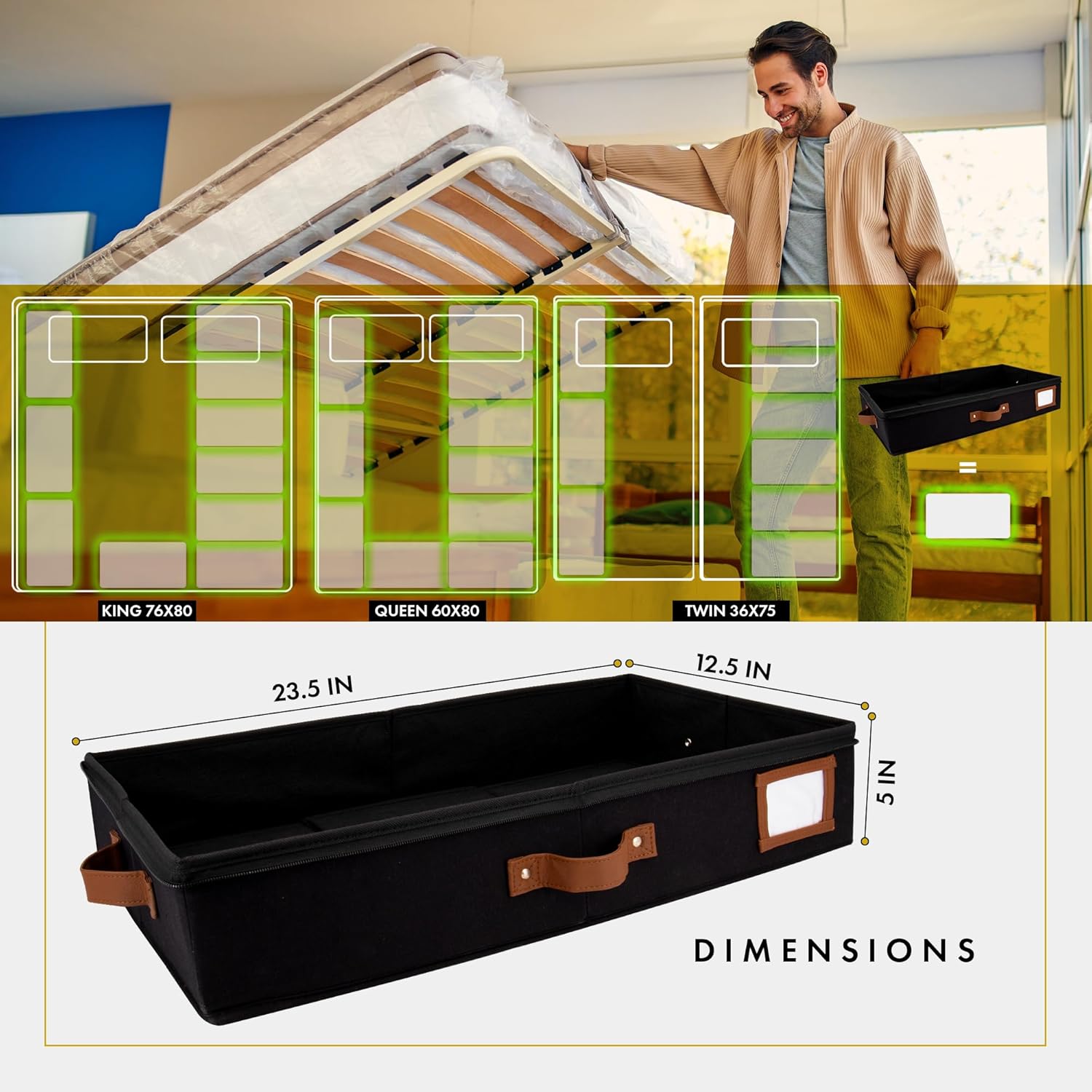 - 𝐒𝐮𝐩𝐞𝐫𝐢𝐨𝐫 𝐂𝐚𝐧𝐯𝐚𝐬 & 𝐌𝐚𝐭𝐞𝐫𝐢𝐚𝐥: Made from premium quality canvas fabric, our 23.5x12.5x5" Under Bed Storage Containers With Lids are durable, sturdy, & carefully designed to hold large quantities of clothes, blankets, shoes, & various bed accessories. These under bed storage dorm drawers are designed to fit perfectly under your bed for efficient bed room organization and storage, making it an under bed organizer that will easily blend into your home's aesthetic style.