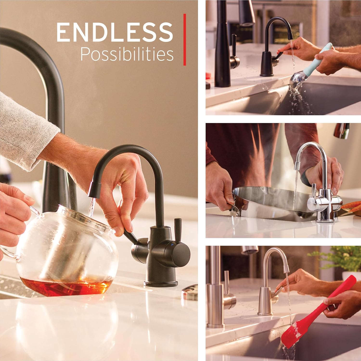 - ON-DEMAND, NEAR-BOILING WATER: Instant hot water (approximately 200 degrees F) right next to the main kitchen faucet when you need it, for cooking, cleaning, and more; a time, space, and energy saver that lets you get on with more important things in life