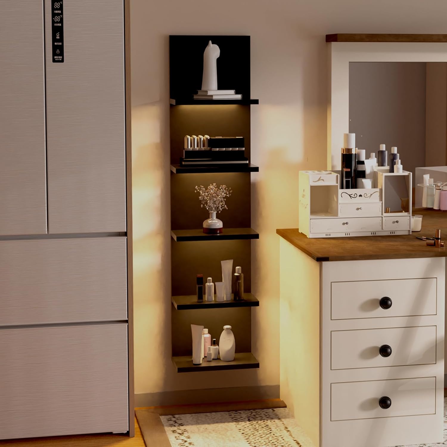 5 Tier Wall Shelf Unit, Black Modern Vertical Lack Wall Shelves with Light, Wall Mount, Floating Column Home Decor Shelves for Bedroom, Living Room, Vanity Storage Display