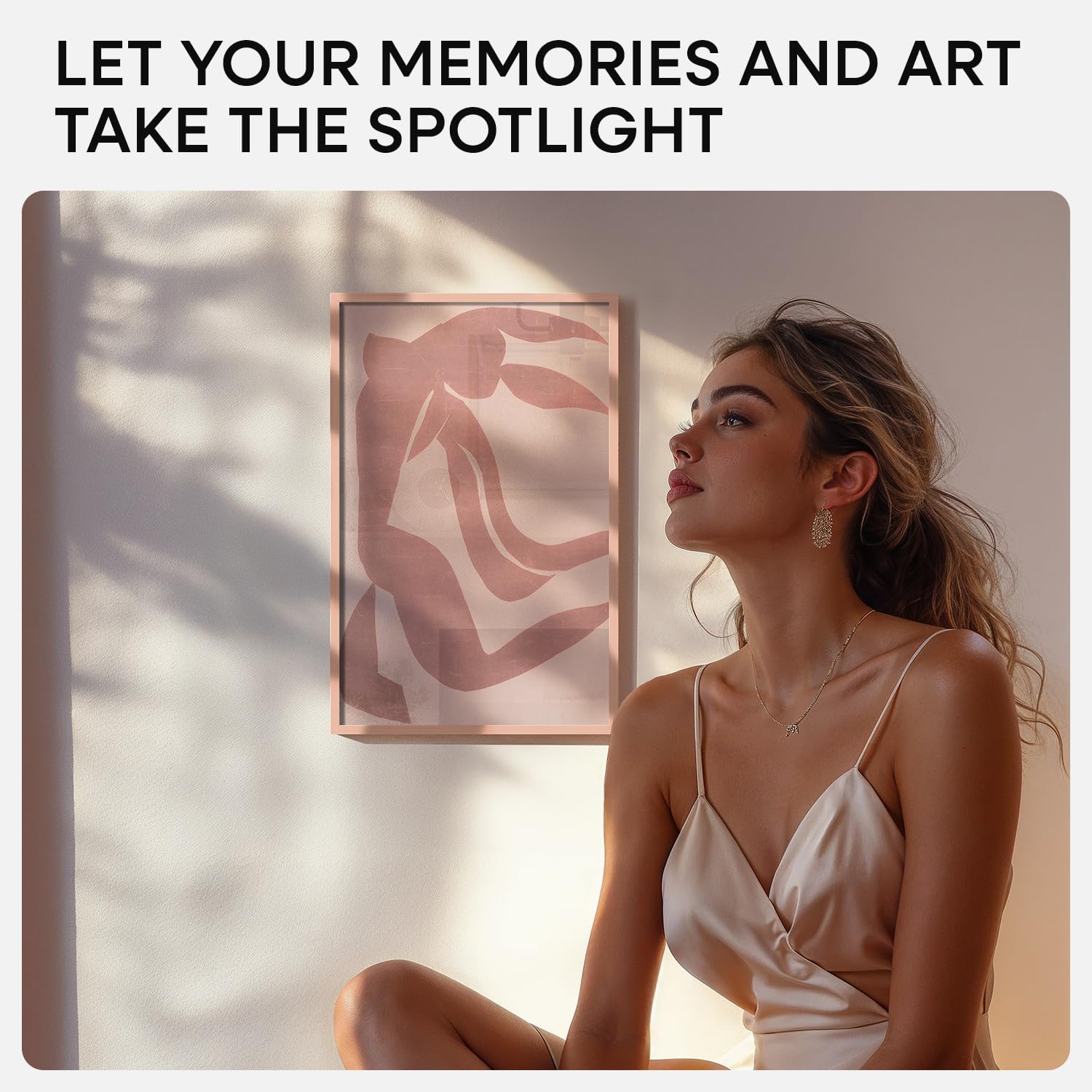 - ROSE GOLD. SOFT GLOW. This aluminum frame features a muted rose finish with a satin texture. It brings gentle contrast to light walls and softens modern interiors with a hint of warmth.