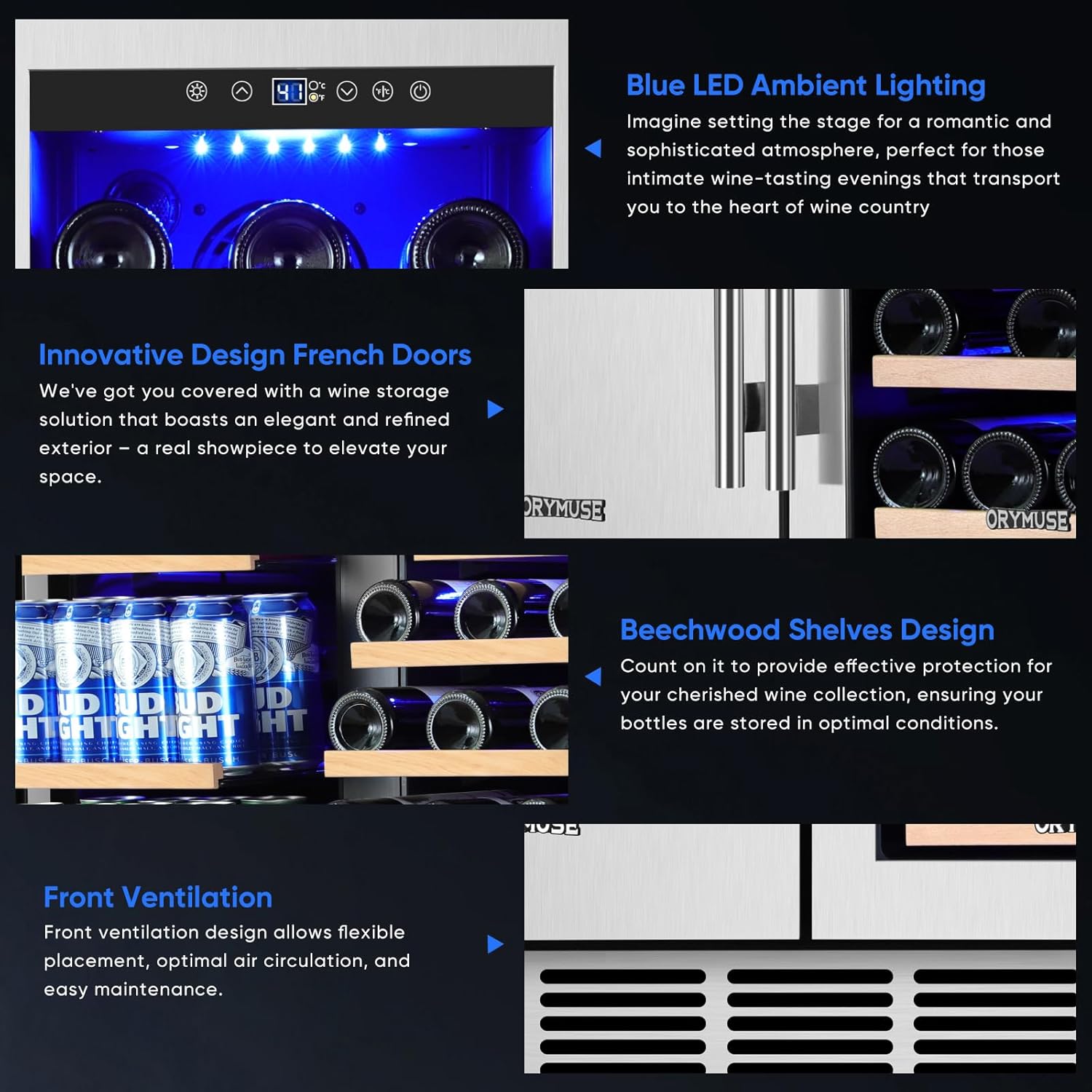 - WHY CHOOSE ORYMUSE - Whether you're a wine enthusiast or simply enjoy a perfectly chilled drink, the ORYMUSE Dual Zone Wine and Beverage Fridge is designed to enhance your experience. With independent temperature zones, ample storage space, and precise temperature control, your favorite wines and beverages are always served at the ideal temperature. Perfect for home bars, kitchens, offices, or entertainment areas, this sleek and stylish appliance delivers reliable performance, effortless convenience, and modern elegance — all in one