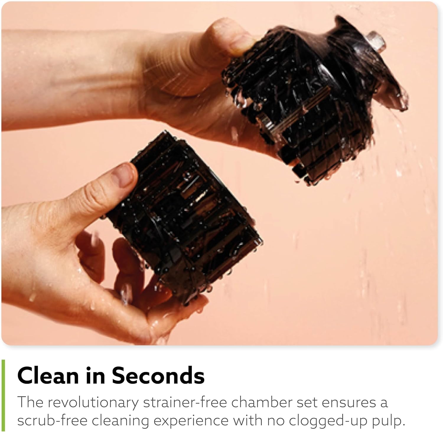 - EASY TO CLEAN: Traditional juicers require a strainer which collects minerals and needs extensive scrubbing. The H400 features a revolutionary strainer-free chamber set that ensures a scrub-free cleaning experience with no clogged up pulp.
