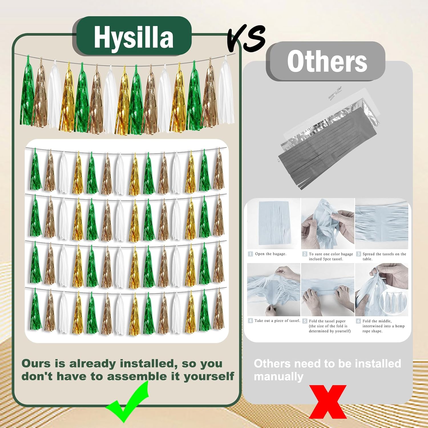 - 【Perfect Party Decoration】The sage green beige mint gold tinsel garlands are designed in a metallic Fringe, bright, and beautiful, at the same time, they shine in the sun, and these gorgeous tassel garlands create a wonderful backdrop or centerpiece for your party space. and bring you, your family, and your friend's good Visual effects. your party many emotional and touching moments where a lot of pictures will be taken and everybody will have a wonderful time together.