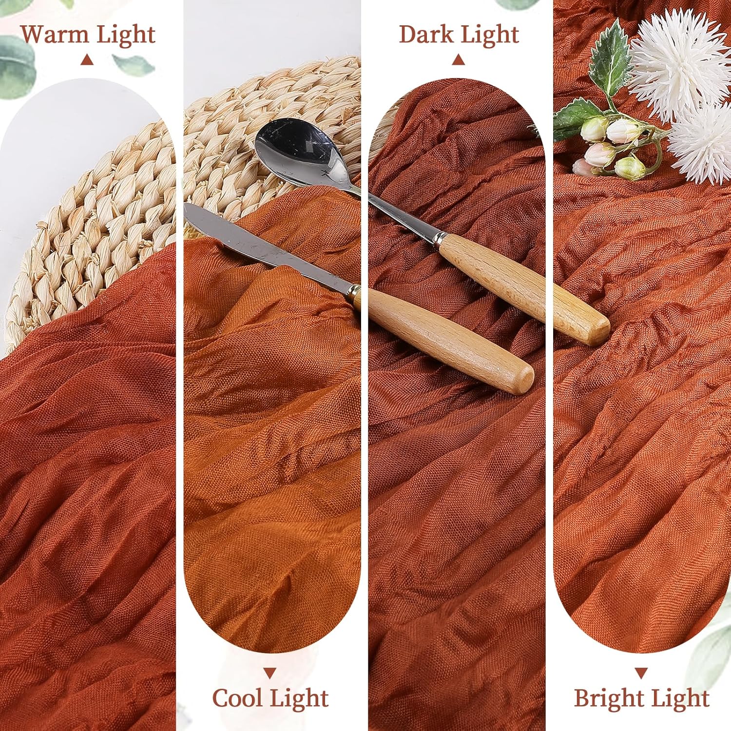 - PACKAGE INCLUDED: You will receive 12 pieces of terracotta cheesecloth table runners. Elegant and beautiful design, exquisite workmanship. Product size: Each boho table runner is 35 x 120 inches. Enough to cover rectangles and round tables, as well as long tables that are stitched together. It can even be used to belt chairs decorate napkins, background curtains. Round or square tables for 8-10 people, perfect for romantic and elegant party events