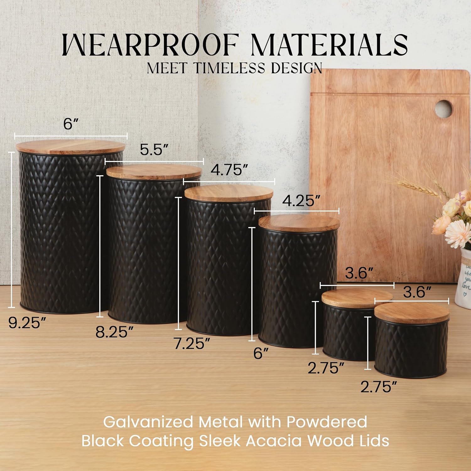 - Beauty Is in the Details – Elevate your style as you reduce stress. Your kitchen canister set delivers high-end quality with black galvanized metal and sleek acacia wood to complement any aesthetic.