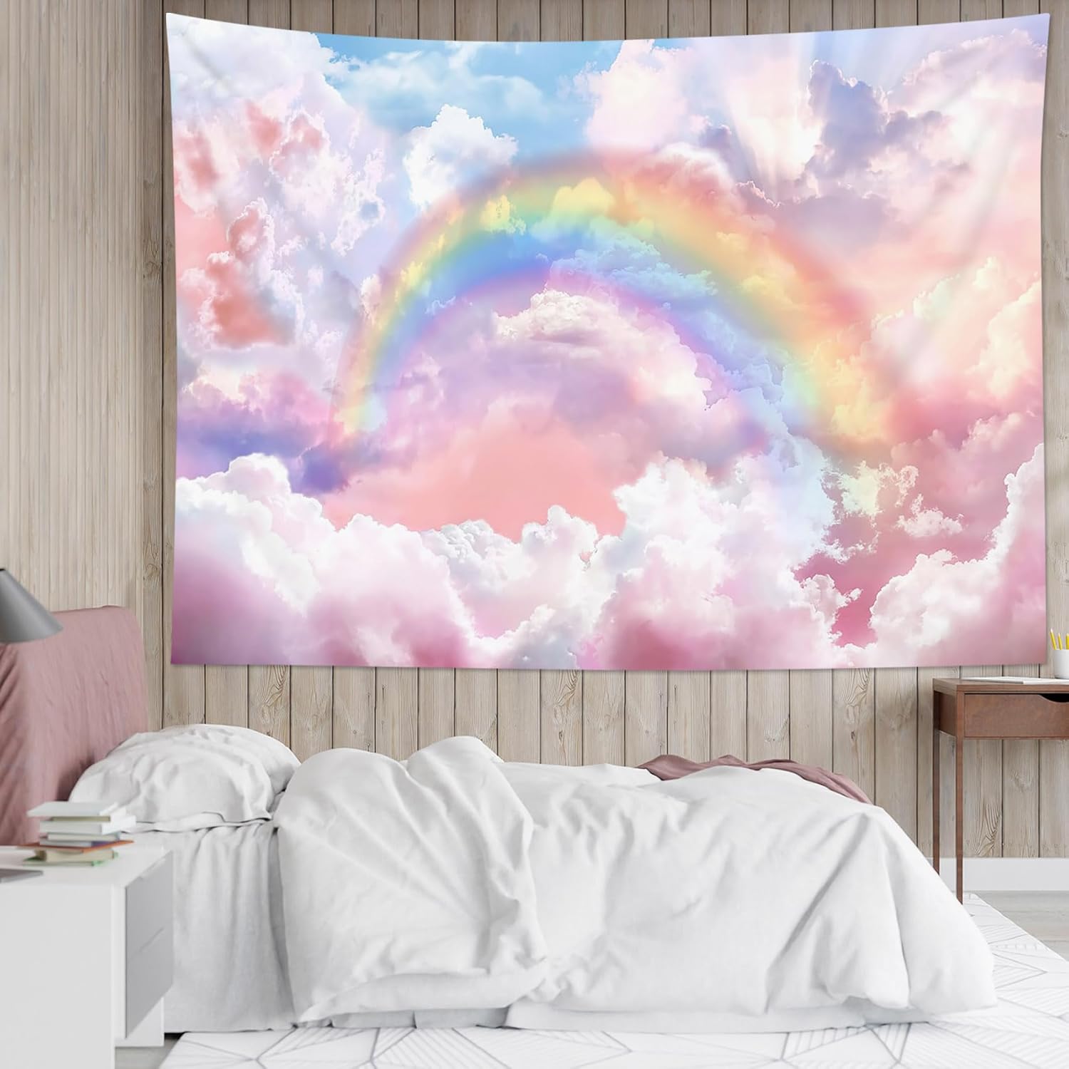 HVEST Rainbow Cloud Tapestry Wall Hanging, Rainbow and Pink Cloud with Glow Sunshine in Pastel Sky Tapestry, Aesthetic Nature Landscape Tapestry for Living Room Bedroom Aesthetic Decor, 36L x 48W Inches
