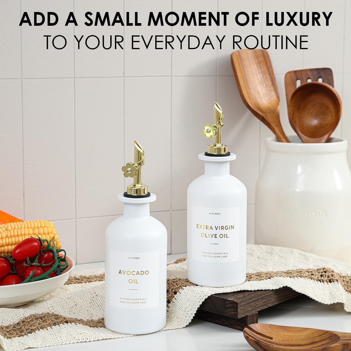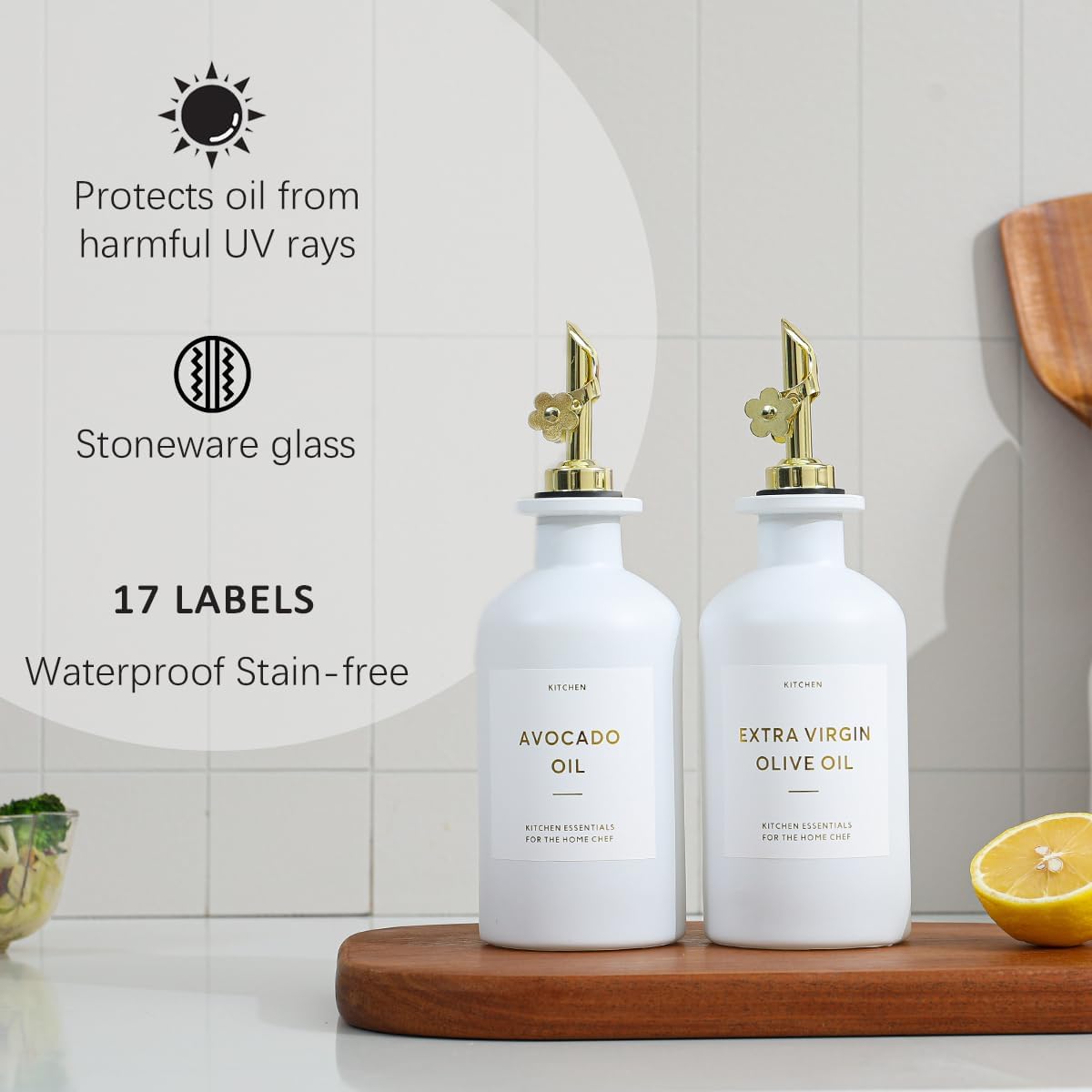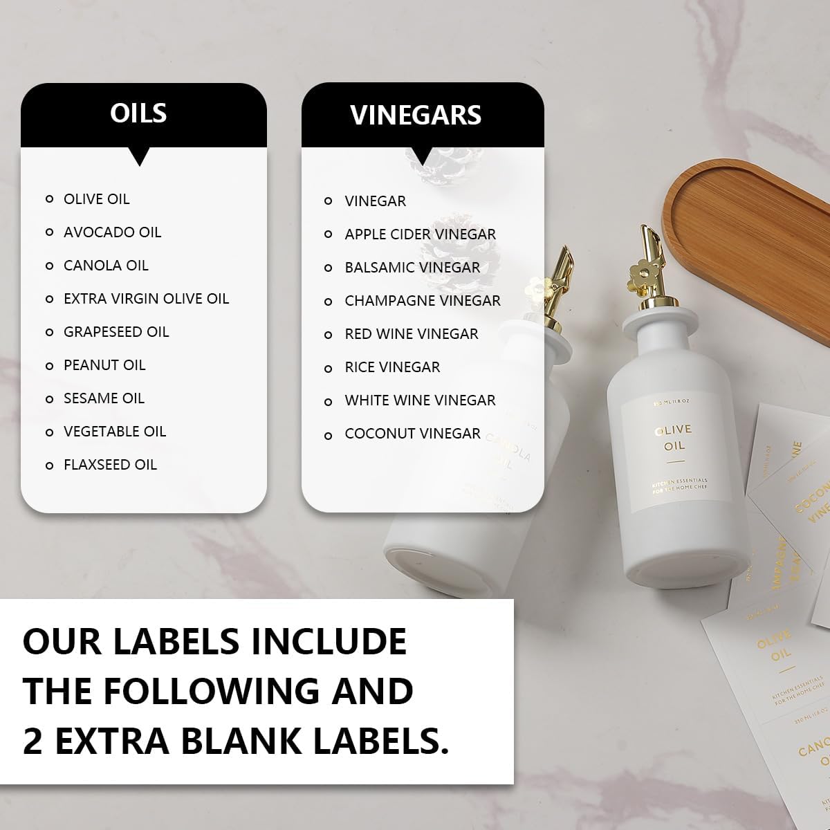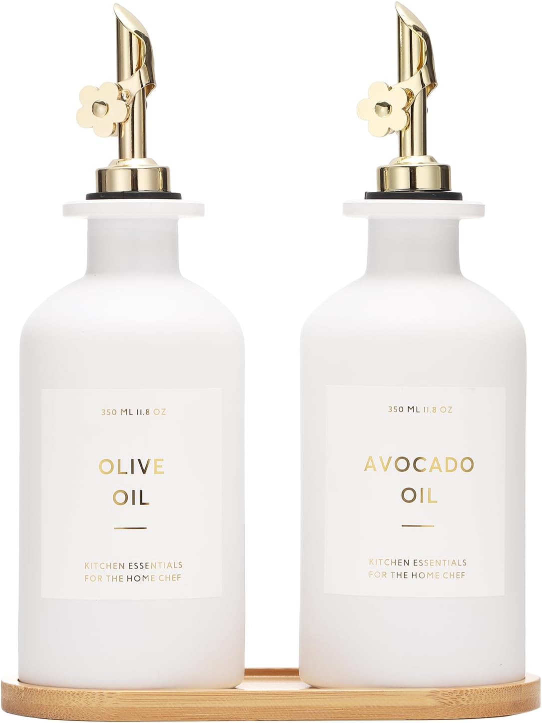 - KITCHEN OLIVE OIL DISPENSER BOTTLES – The oil and vinegar dispenser set contains 2 white 11.8oz (350ML) glass bottles, 2 gold stainless steel oil spouts, 17 waterproof labels(kinds of oil and vinegar) and a bamboo tray, Ideal for safely store and dispense your olive oil and vinegar.