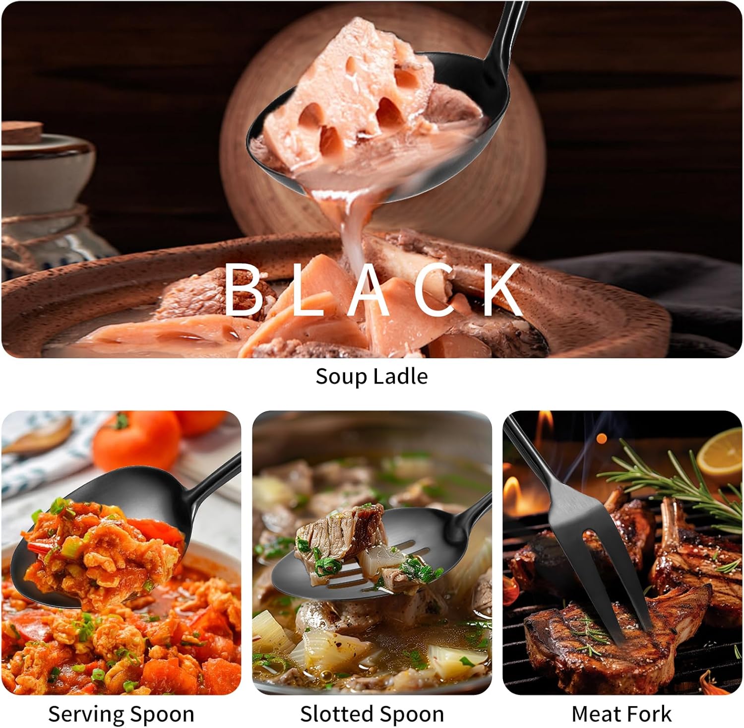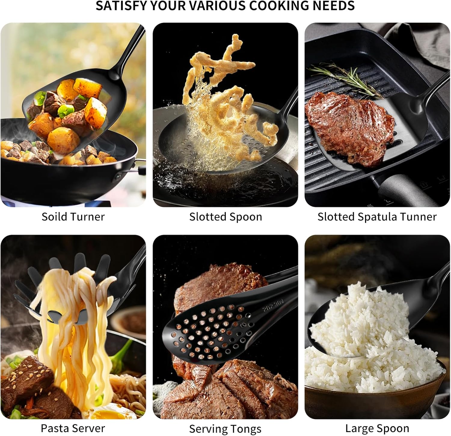 304 Stainlss Steel Matte Kitchen Utensils Set, 12 Pcs Long Metal Cooking Utensil Gadgets Tools Set with Spatula, Ladle, Spoon, Ladle, Skimmer, Tunner, Pasta Server, Tongs(Black, Dishwasher Safe)