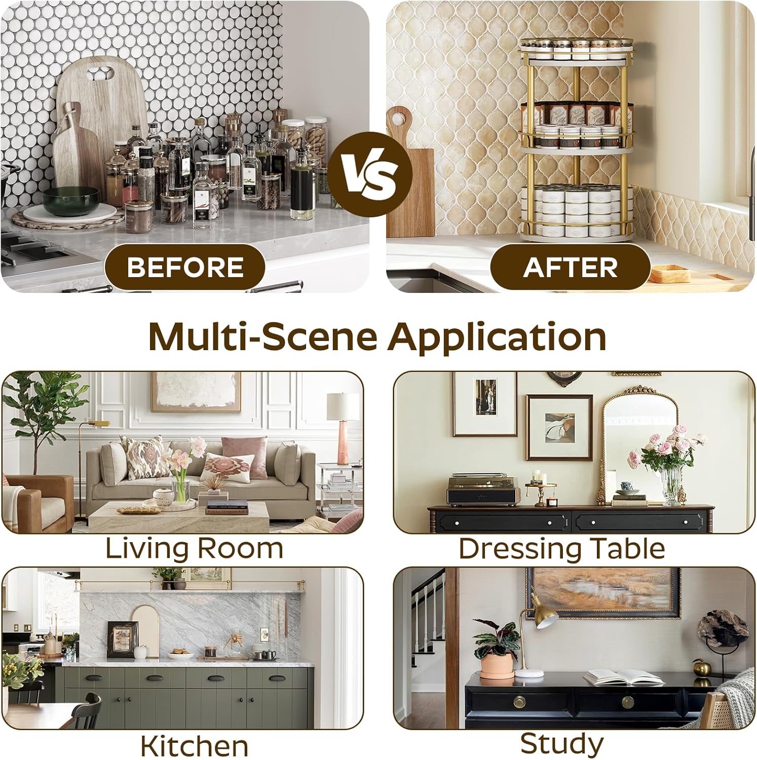 - Reduce Countertop Pressure: Place the lazy susan on the kitchen countertop to keep spice jars handy and the cooking area less messy. Use it on a dressing table to store your favorite cosmetics or on a dining table to easily locate your preferred spices