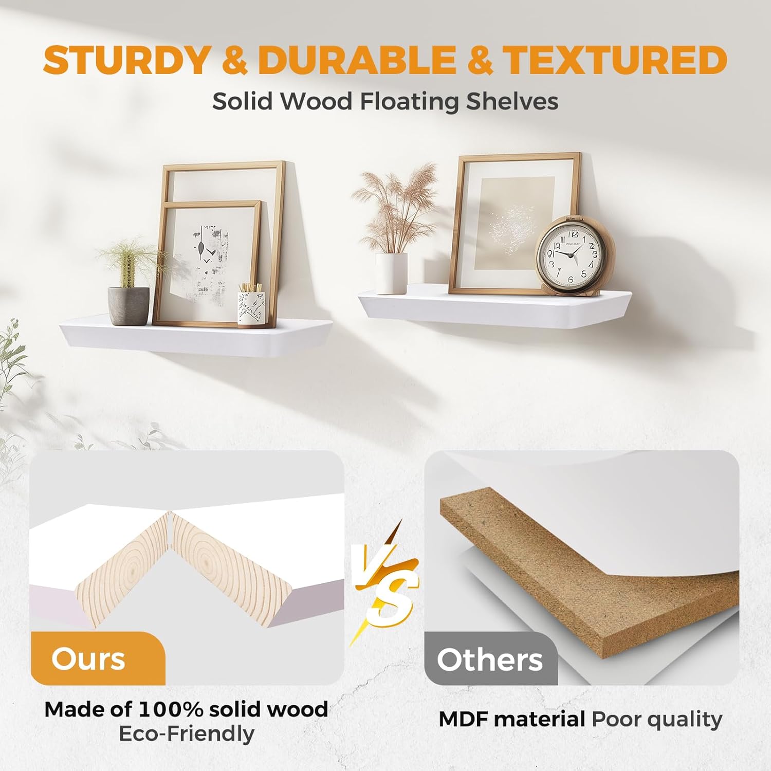 24"x6.8"x1.6" Slanted Floating Wall Shelves 2-Pack - Rustic White Finish, Heavy-Duty Solid Wood Design with Hidden Brackets - Perfect for Living Room, Kitchen, Bathroom, or Office