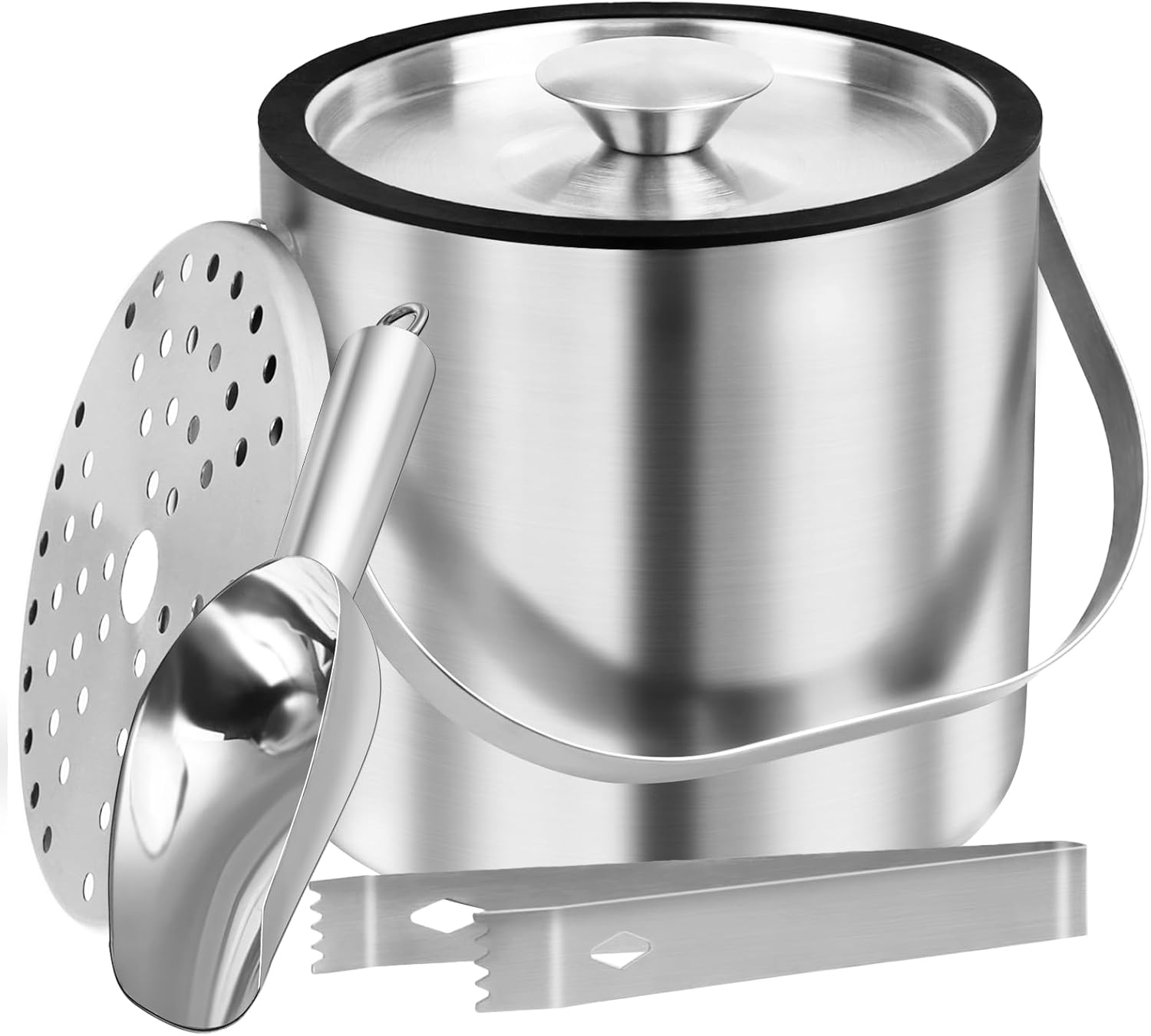 - EXTENDED COOLING TIME: Our double-walled vacuum insulated ice bucket keeps ice cold longer than single-walled buckets. The built-in filter separates melted water from ice, keeping your ice intact. Plus, the sweat-free design means no more wiping condensation off your table. Enjoy chilled drinks all afternoon!