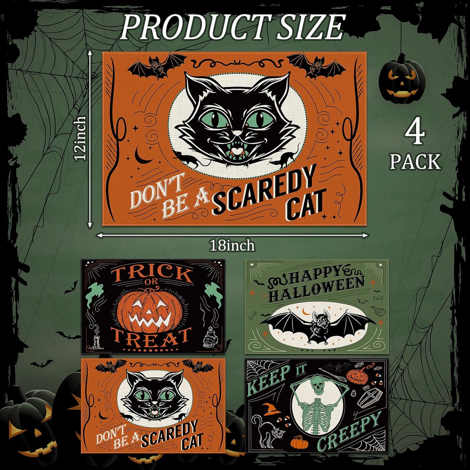 4Pcs Halloween Placemats Pumpkin Bat Black Cat Skeleton Table Mat Vintage Decorative Place Mats for Party Table Setting Decor, 12 x 18 Inch