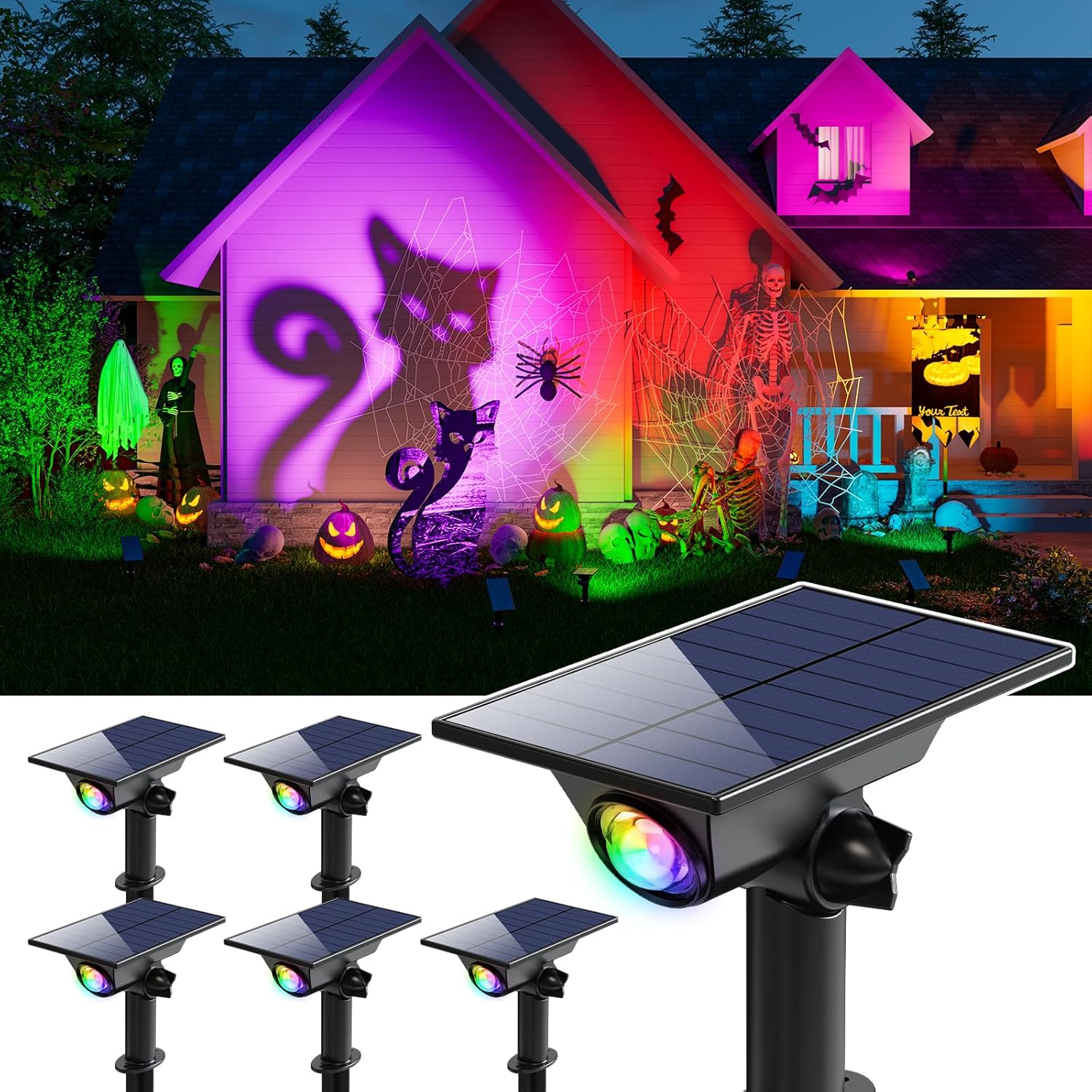 - Illuminate Your Halloween Decorations: Our multicolor solar uplights are perfect for projecting an eerie glow onto your yard, garden, porch, creating a mysterious and spooky atmosphere for trick-or-treaters; Our outdoor solar spotlights create dramatic lighting effects on specific Halloween decorations, spooky trees and spiderweb-covered bushes, scary pumpkin faces, spooky tombstones, creepy skeletons, and cackling witches, adding different colors and atmosphere to the garden, making the garden scary and mysterious on Halloween night.