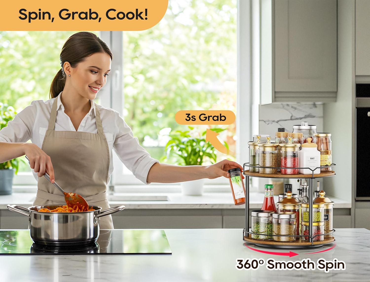 - 1. Stay Organized in Style: Ditch clutter and stay organized with our two-tier turntable Lazy Susan! This beautiful wooden rotating spice rack spinner is perfect for any table top, farmhouse bathroom decor, round decorative tray for your vanity, counter, sink, coffee table, and much more