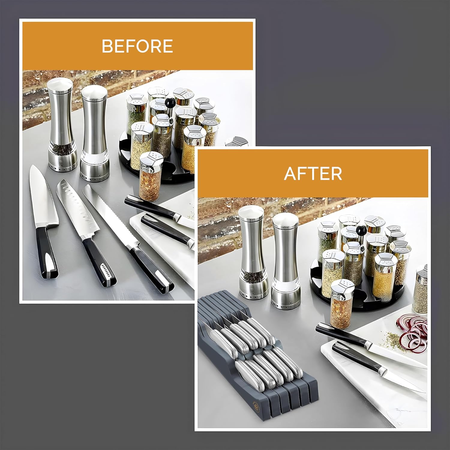 - IN DRAWER KNIFE ORGANIZER: No more keeping a clunky knife block out on your counter. (Measure your drawer and knife heights to see if it’ll fit for you.) The steak knife block fits a total of 5 large knives + 6 small ones, or 16 short knives.
