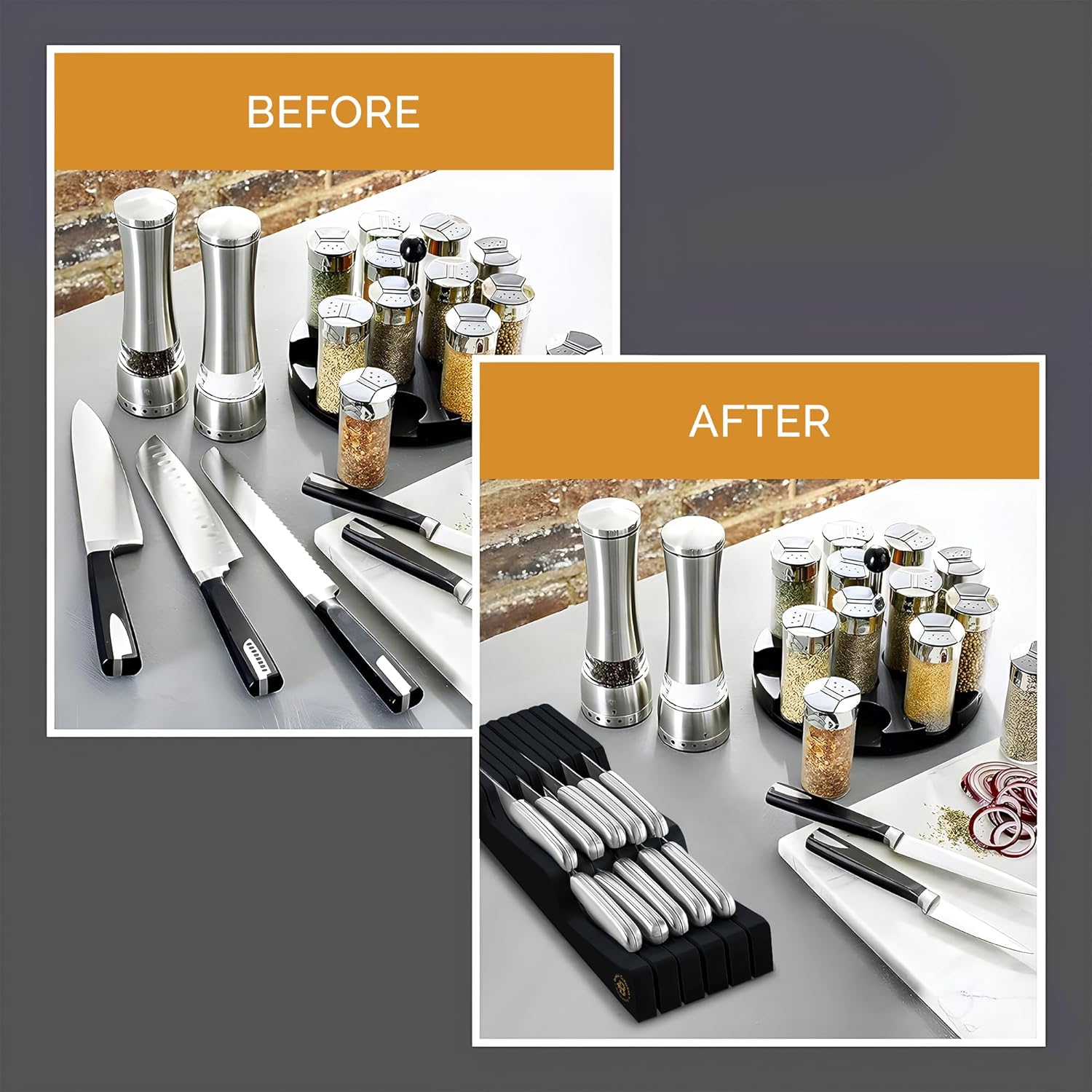 - IN DRAWER KNIFE ORGANIZER: No more keeping a clunky knife block out on your counter. (Measure your drawer and knife heights to see if it’ll fit for you.) The steak knife block fits a total of 5 large knives + 6 small ones, or 16 short knives.