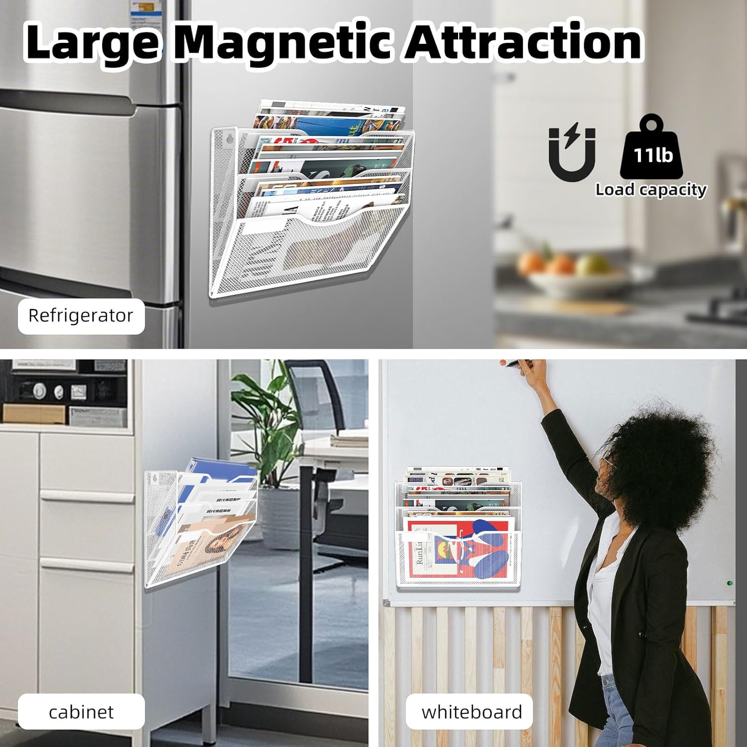 - 【Strong Magnetic File Holder】This durable and sturdy file holder is perfect for organizing all your files, folders, documents, papers, and magazines. With 3mm thick super strong magnets on the back, it can hold up to 11 lbs securely in place, even when filled to capacity. The white magnetic paper holder ensures it stays put without budging.