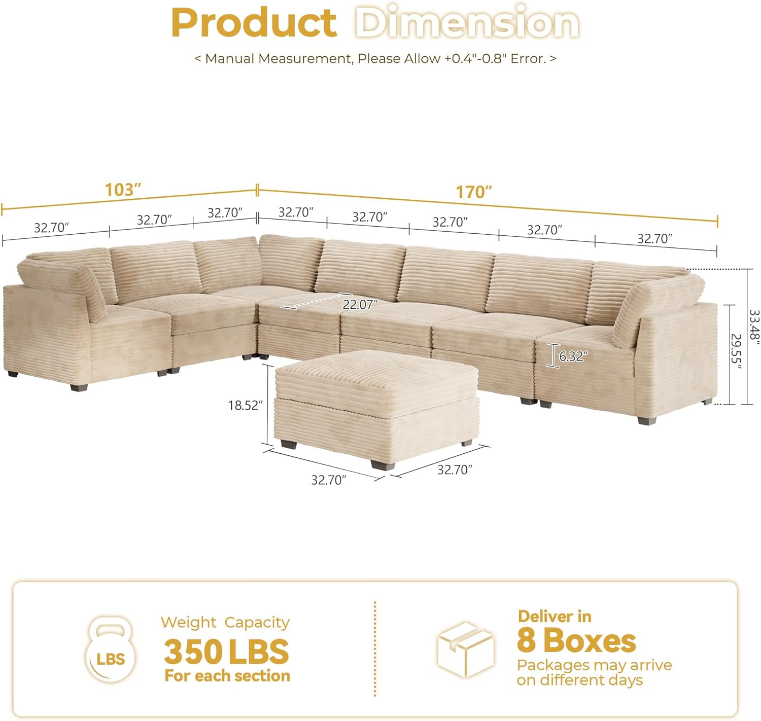 HOOOWOOO Modular Sectional Sofa,8 Pieces Sectional Couches for Living Room,164X66 L Shaped Cloud Couch with Ottoman Chaise Set(Beige Velvet Corduroy)