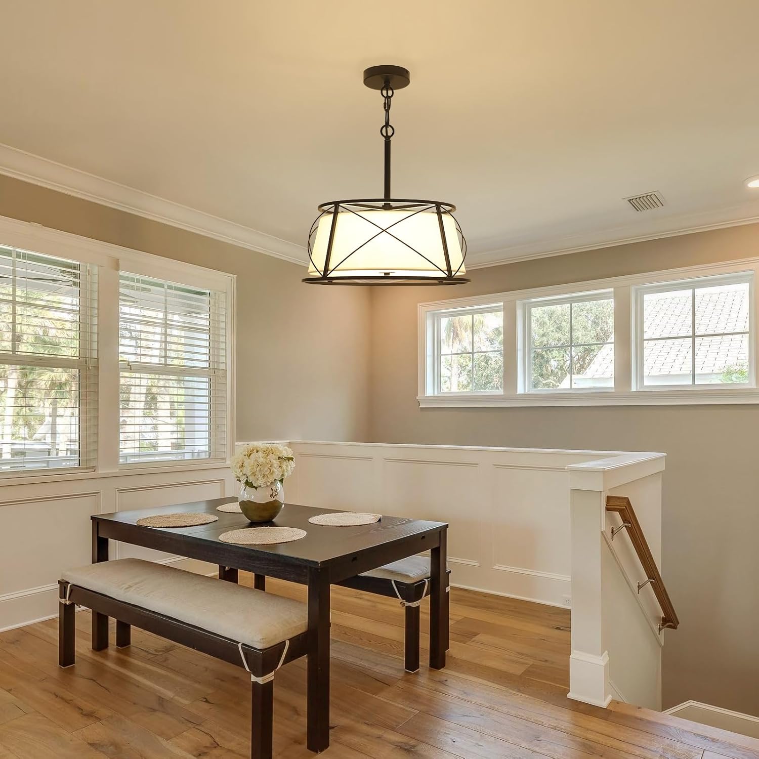 - 【Modern Drum Chandelier】The unique shape of the drum chandelier matte black cross-line hollow frame and white fabric drum shade, modern and elegant design, unique and exclusive styling design, full of artistic sense. placed in your home's kitchen, dining room, hallways and other rooms will become focal point of decoration