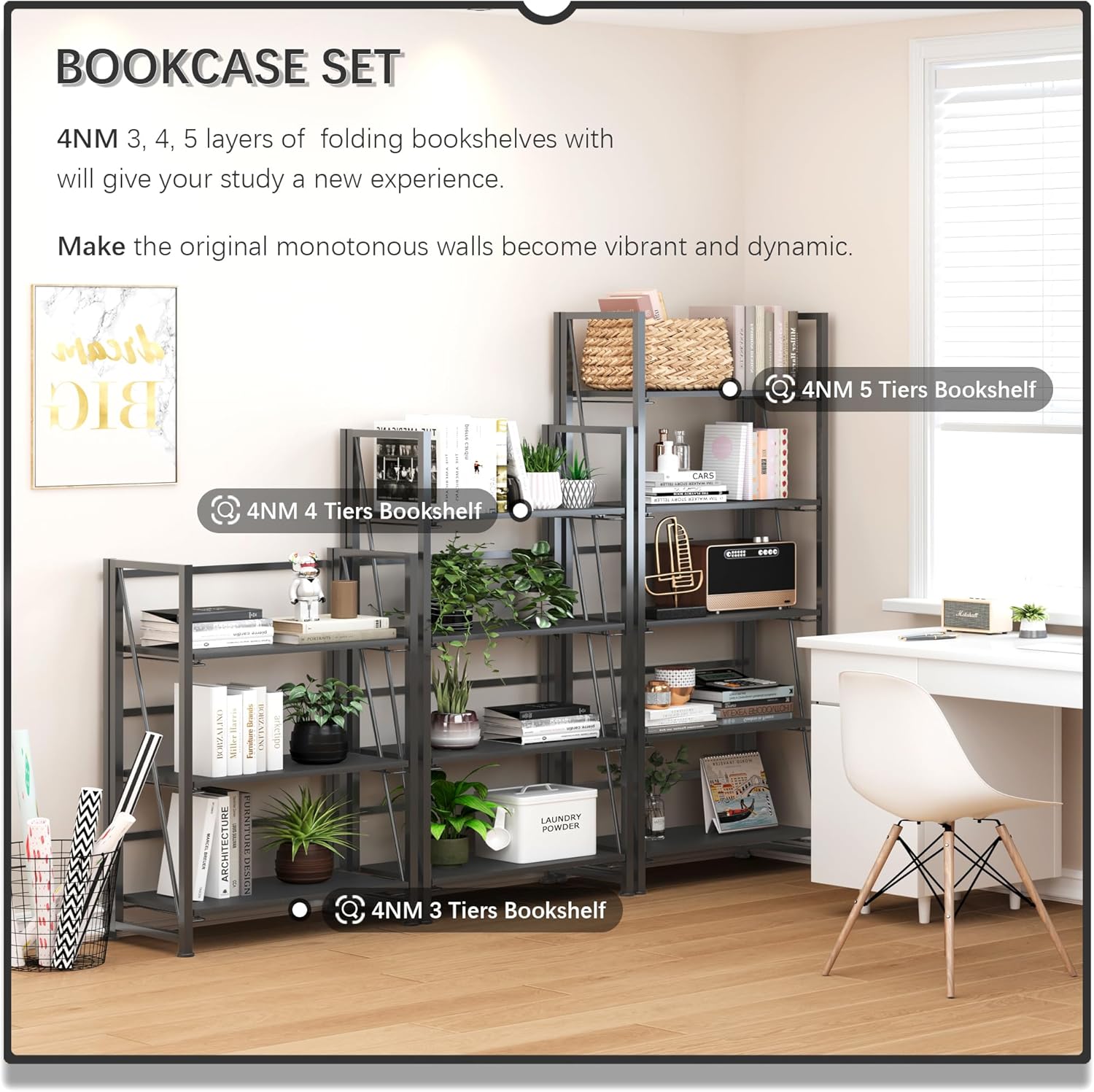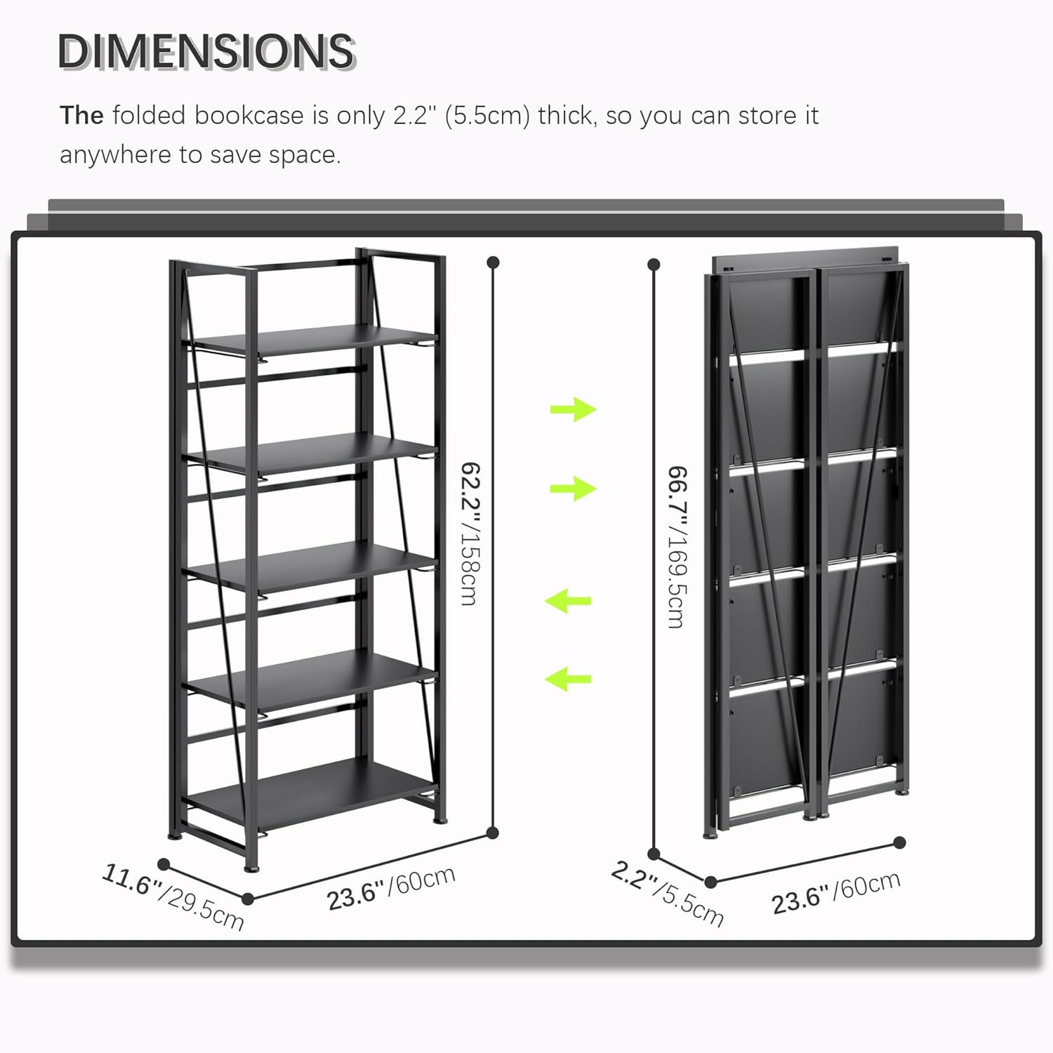 4NM No Assembly Foldable Bookshelf, 5-Shelf Collapsible Bookcase Storage for Small Spaces, 62.2" H, All Black