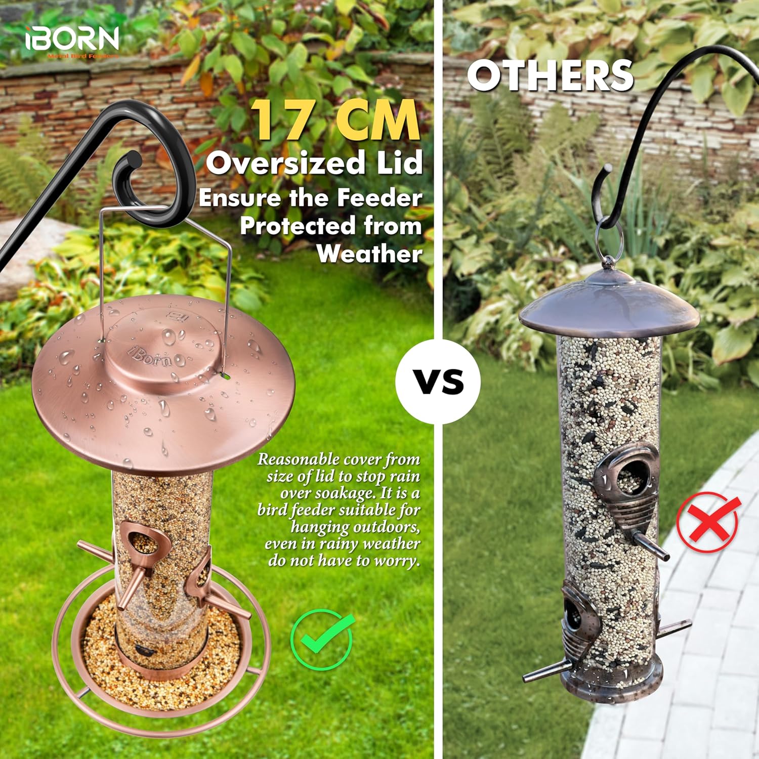 iBorn Bird Feeders for Outdoors, 2LB Metal Bird Feeders 17cm Large Roof &Tray, 4 Feeding Ports, Brushed Copper Finishing