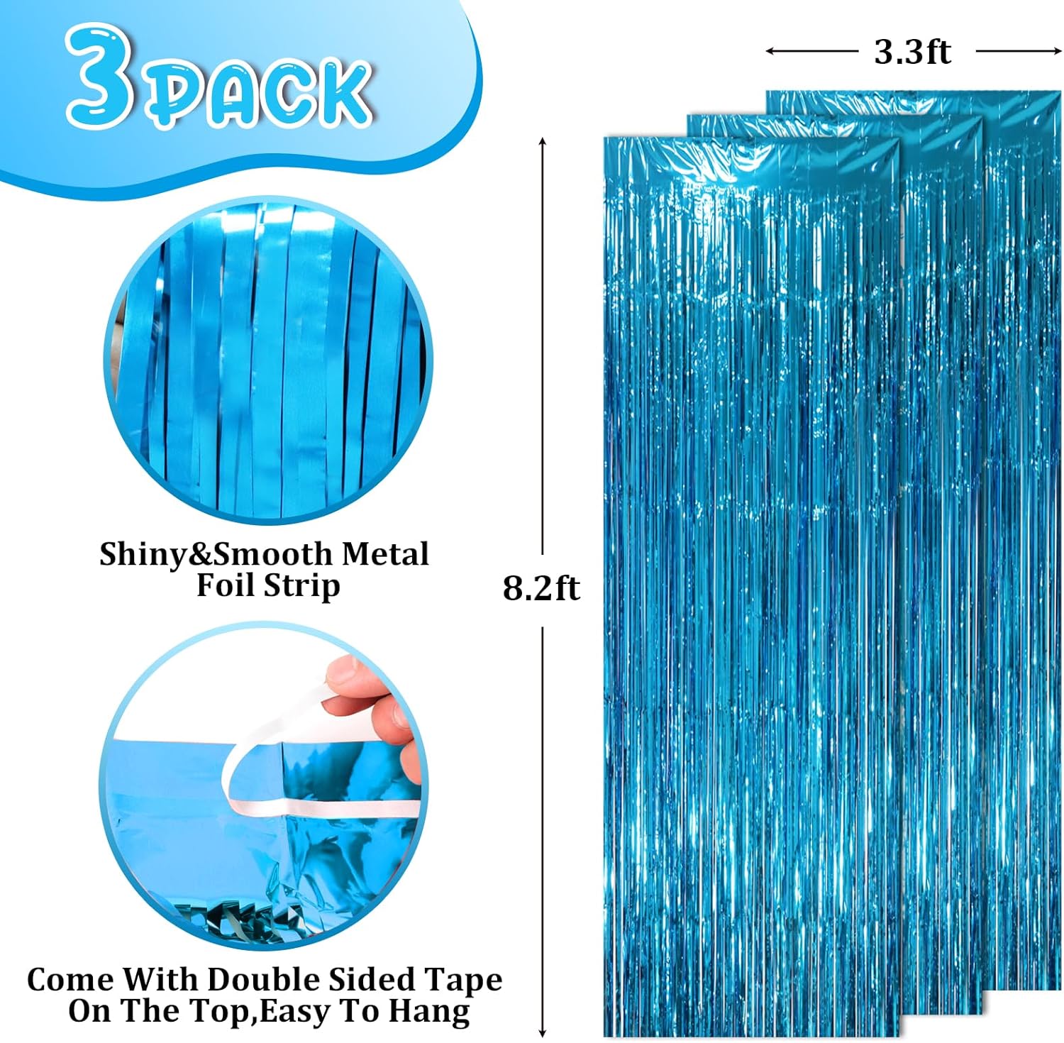 - Package Included: 3 packs of retro blue foil fringe curtains, the size of the foil curtain is 3.3*8.2ft. It's long enough to fit any occasion