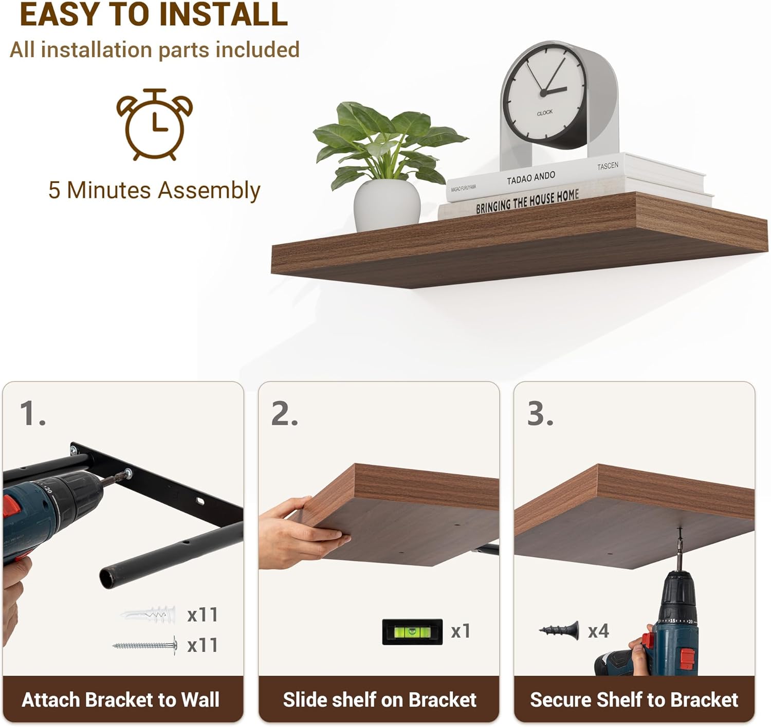 24 Inch Floating Shelves, 24"x9.25"x1.5" Inch Deep Floating Shelves for Wall, Wooden Shelves for Bathroom, Bedroom, Living Room, Walnut