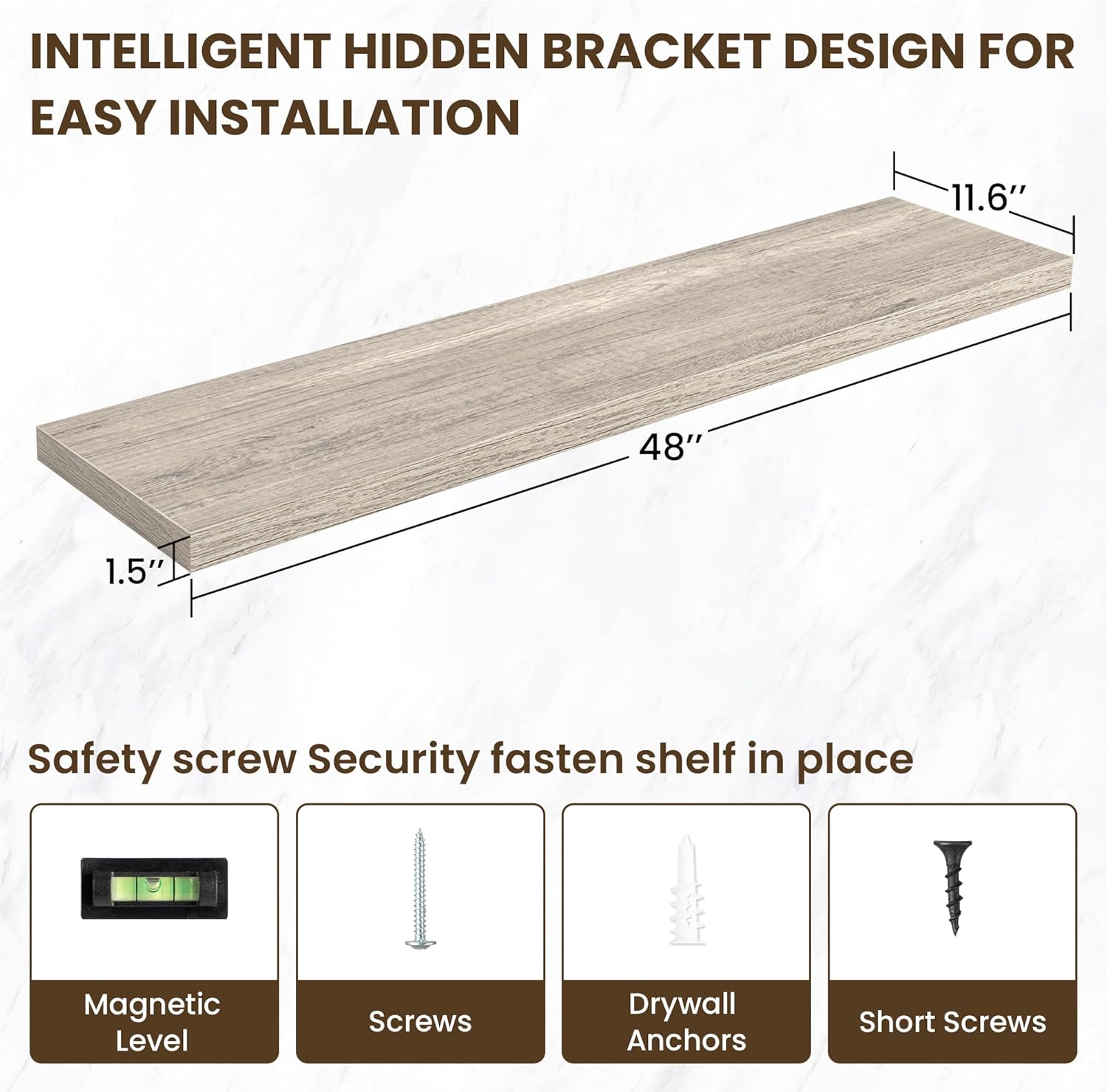 48 Inch Floating Shelves, 11.6 Inch Deep Floating Shelves for Wall, Floating Shelf with Invisible Brackets, Deep Shelves for Bathroom, Bedroom, Living Room, Vintage Gray Oak